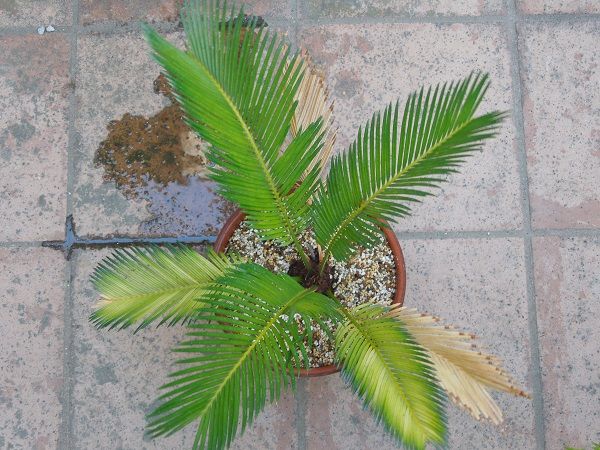 屋外の木の下に置いてあった金環蘇鉄が先日の雨でどこかの枝先から流れ落ちた雨水の直撃を受けて用土が抉れて根が出てしまっていたので植え替えることにした。