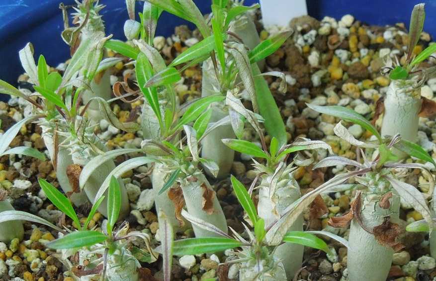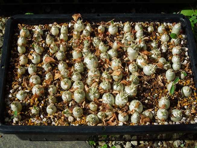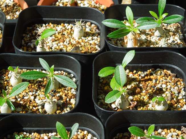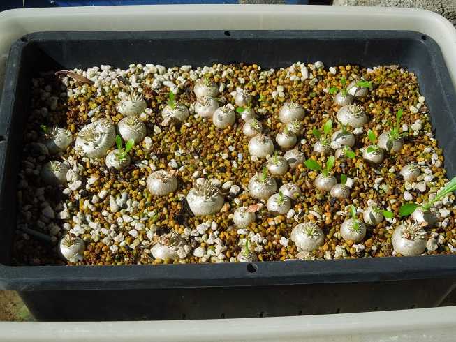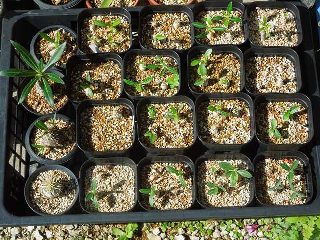 春分を過ぎてから太陽高度が高くなり屋内にあまり日が差し込まなくなったので、パキポディウムの実生苗を天気の良い日は外に出して日に当てている。