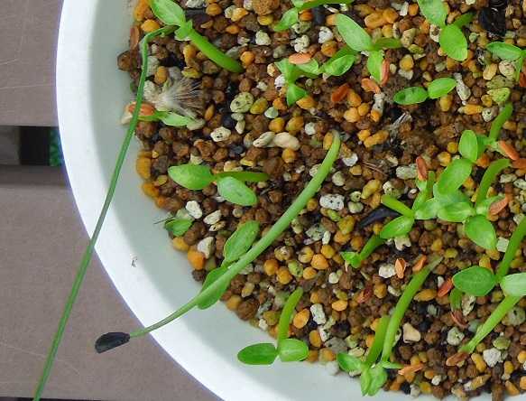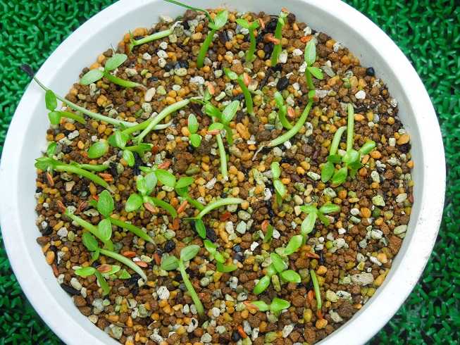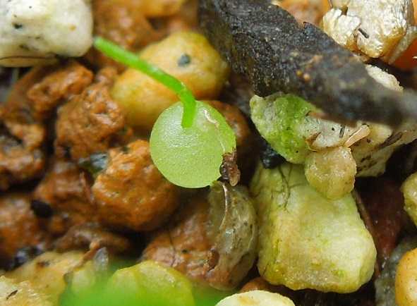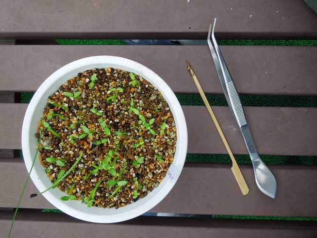 竹串で用土に穴を空けてピンセットで倒れた実生苗を差し込む。