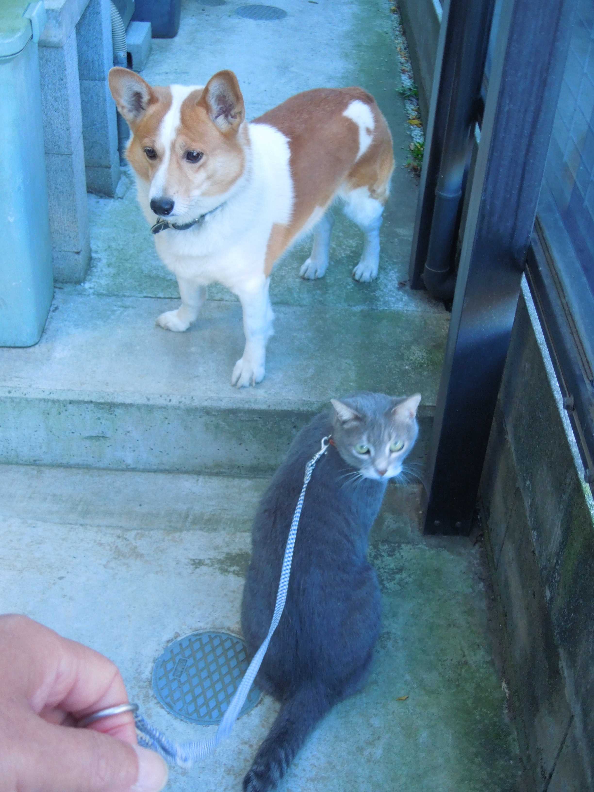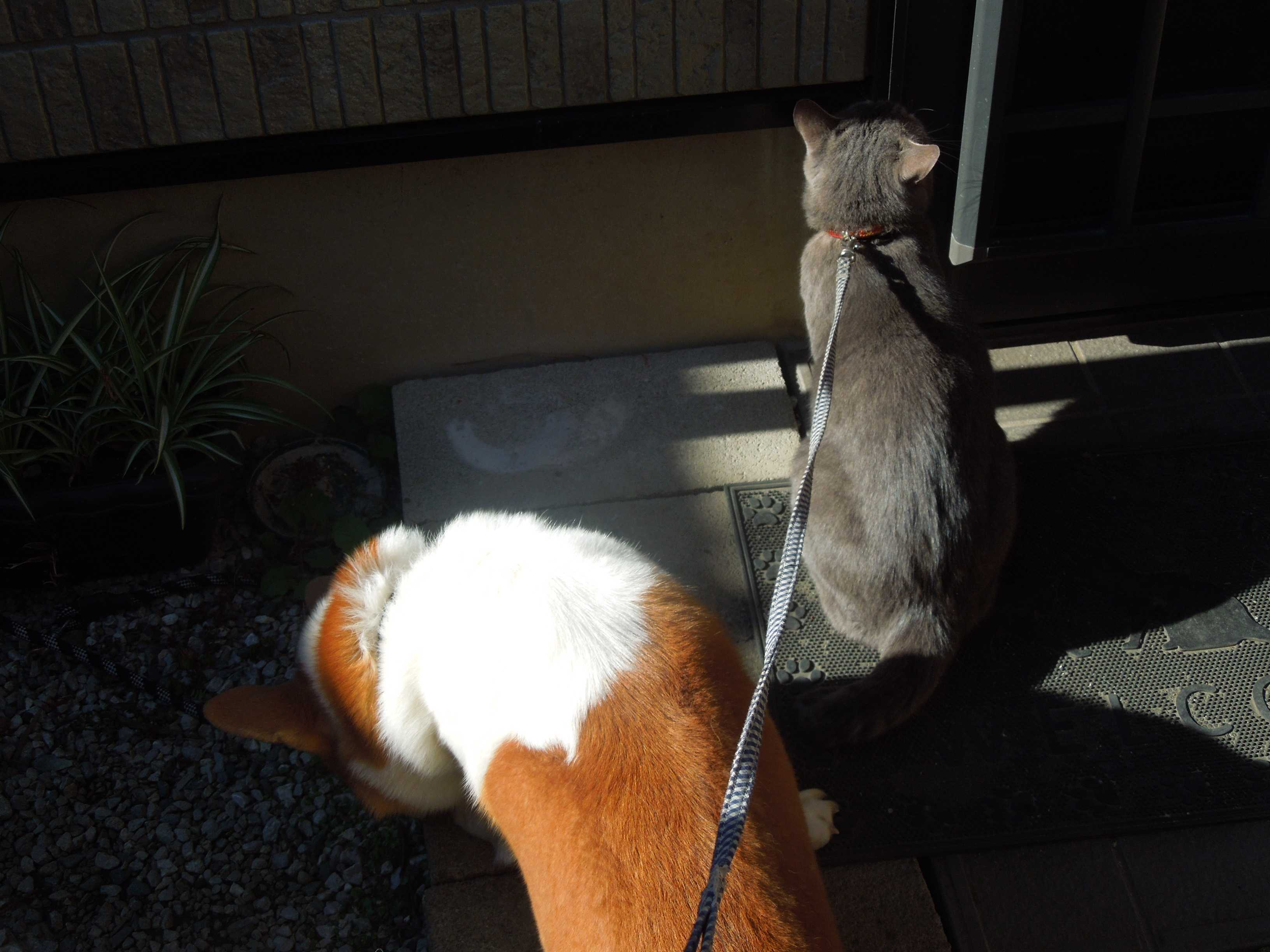 小平太君はリードを付けて家の周りを見回り、小太郎君は走り回っている。