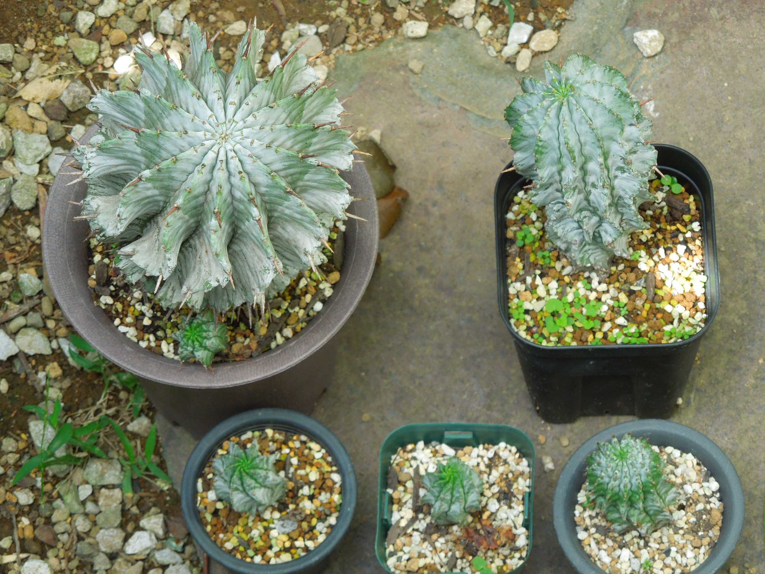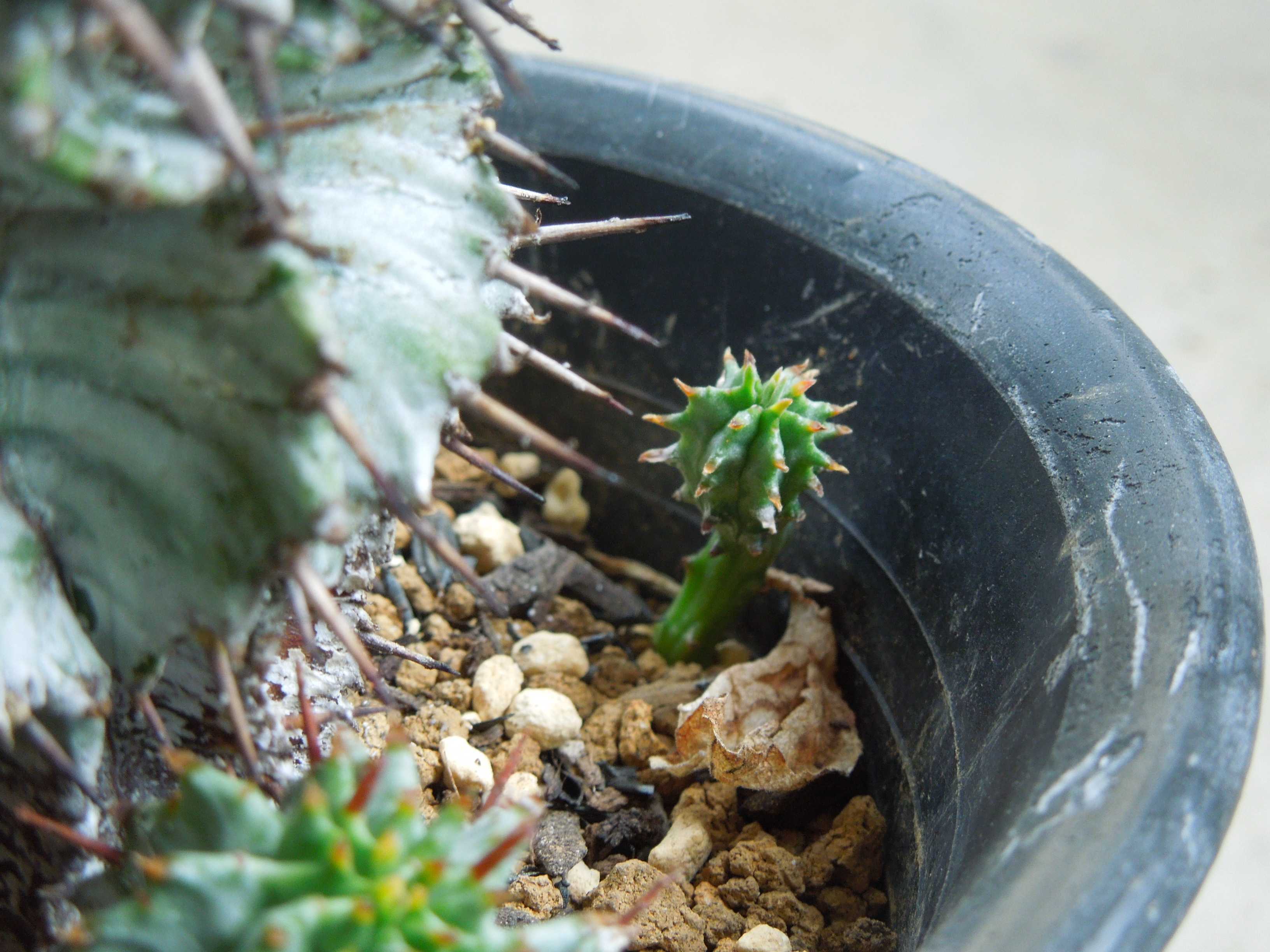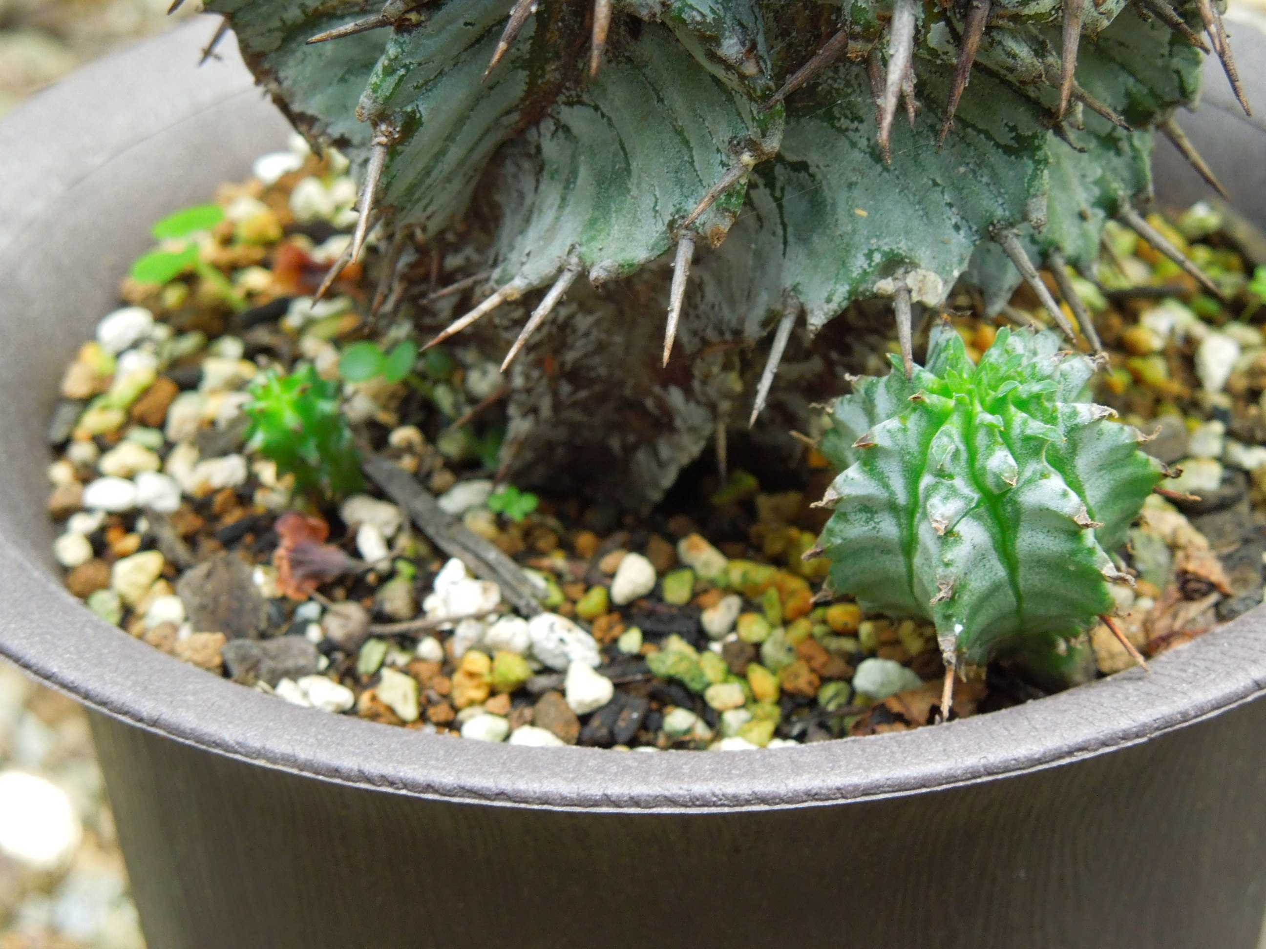 3月に残した小さな子株もだいぶ育って、新しい子株(左)が出てきた。