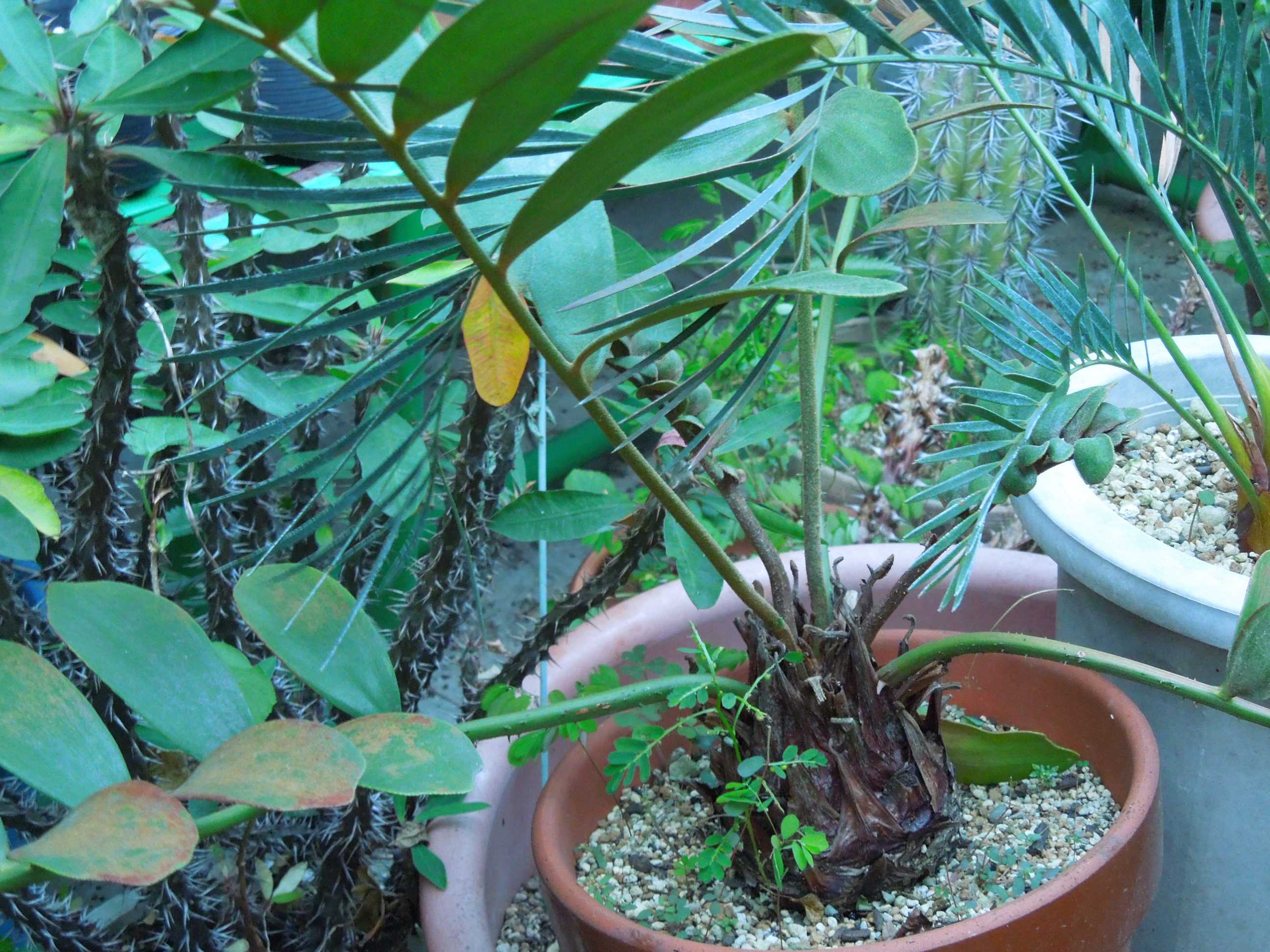 ドルステニアを取り込んで空いた枯れたリンゴの木の大鉢の上に置いたマクロザミア・ムーレイ(右)とザミア・フルフラセア
