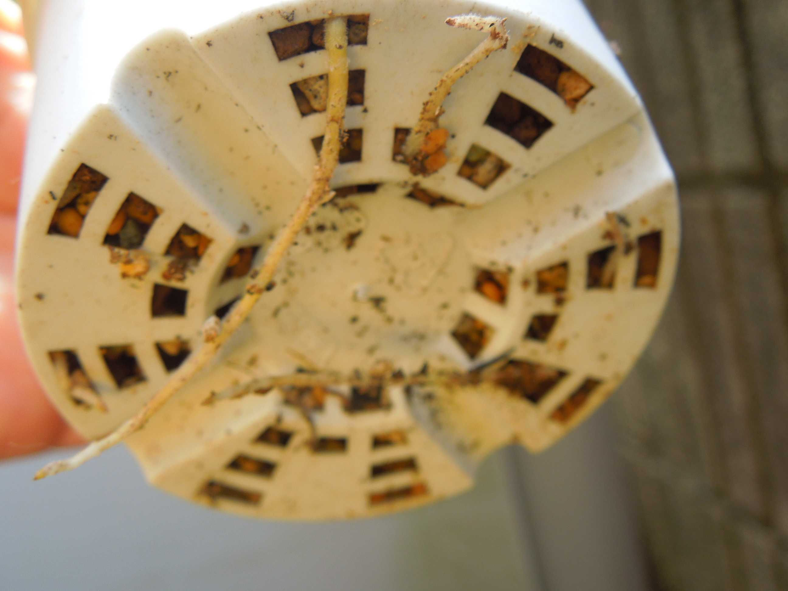 乾きすぎないように、受け皿に水を溜めていた時があったからか鉢底から根が出ていた。