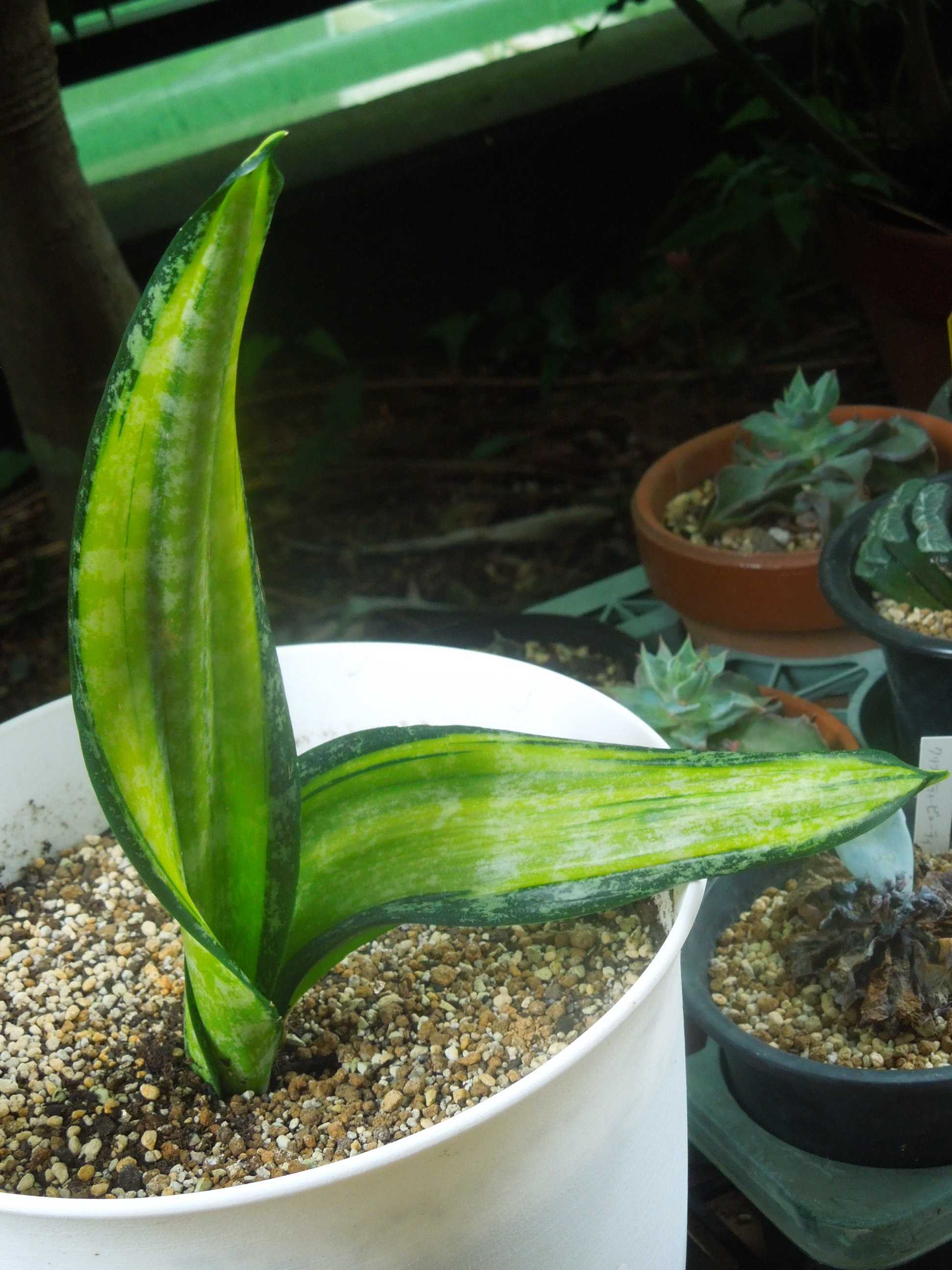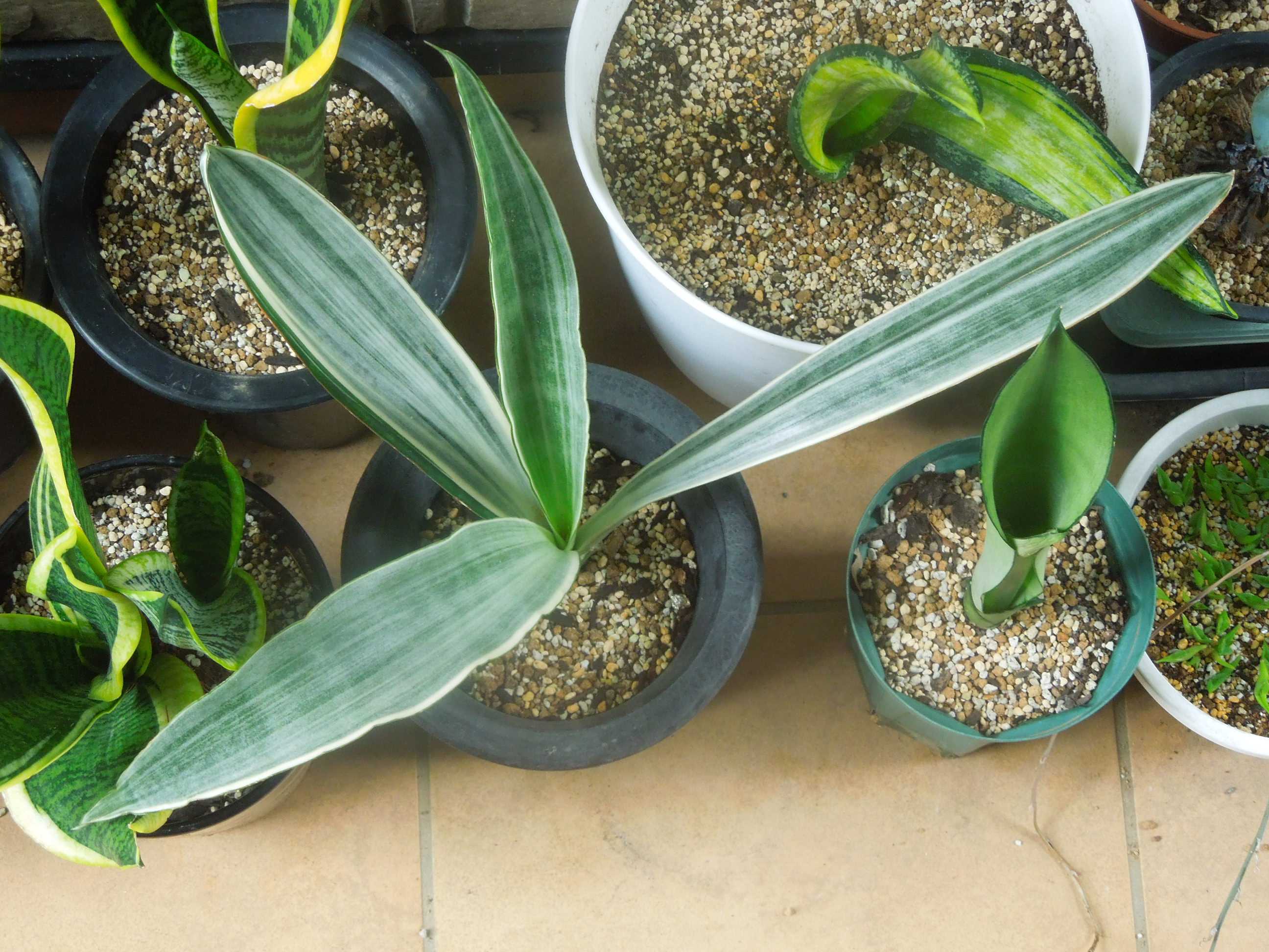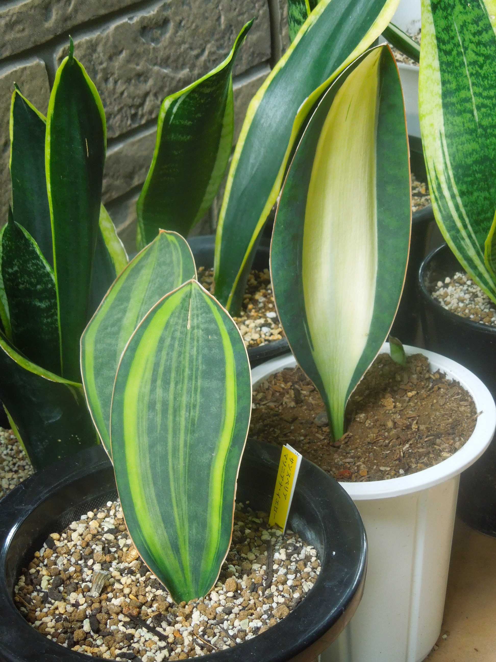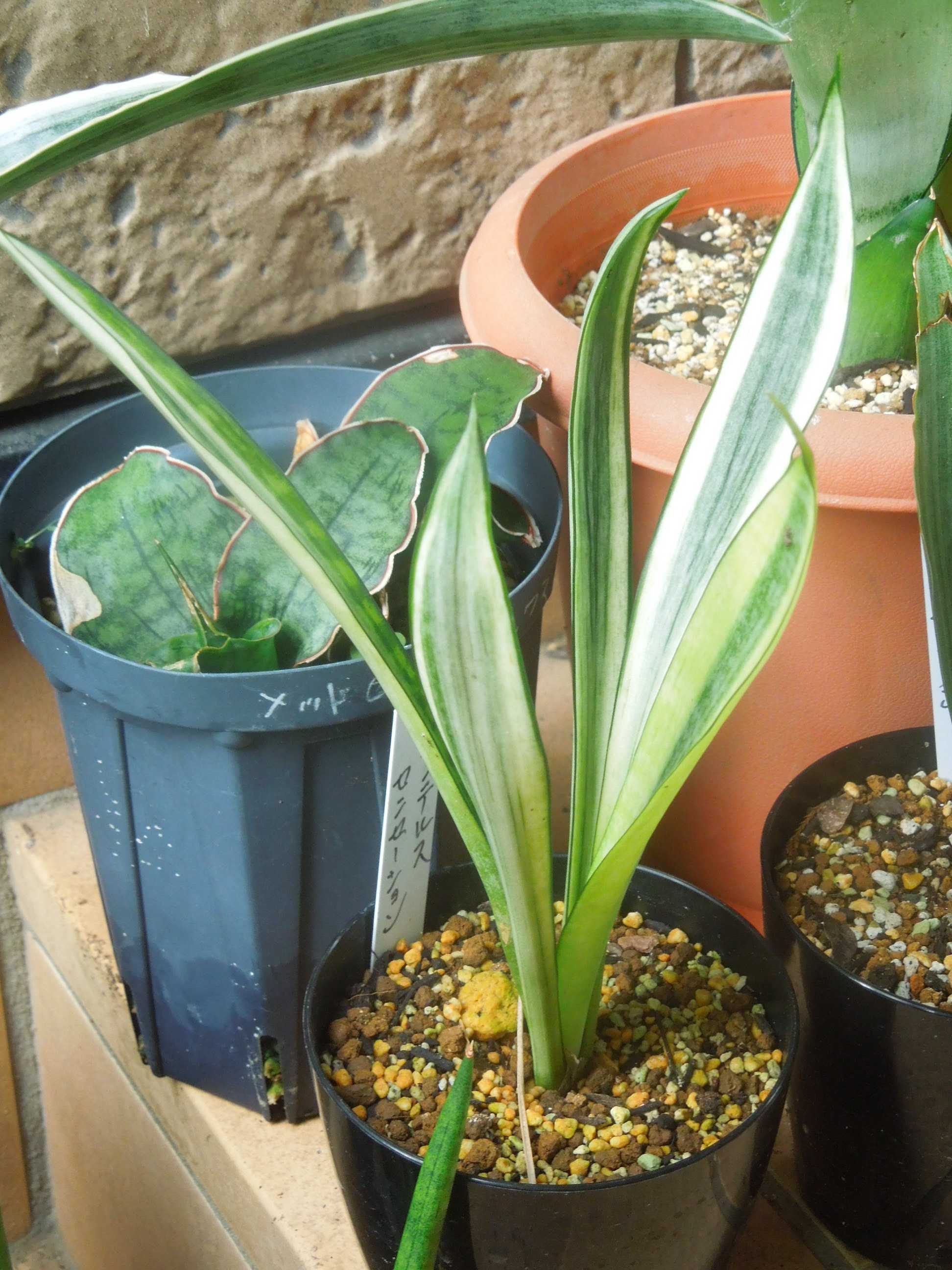 小田園芸さんに分けて頂いた サンスベリア・マッソニアーナ(奥の中斑)。