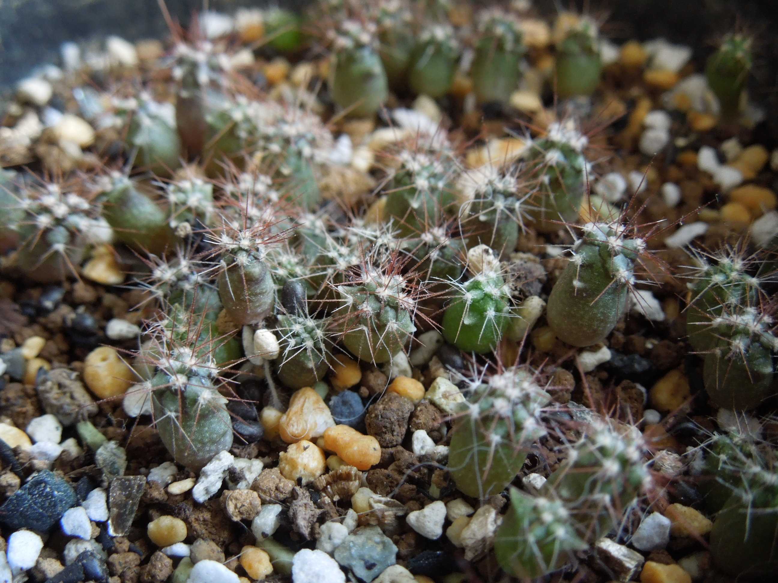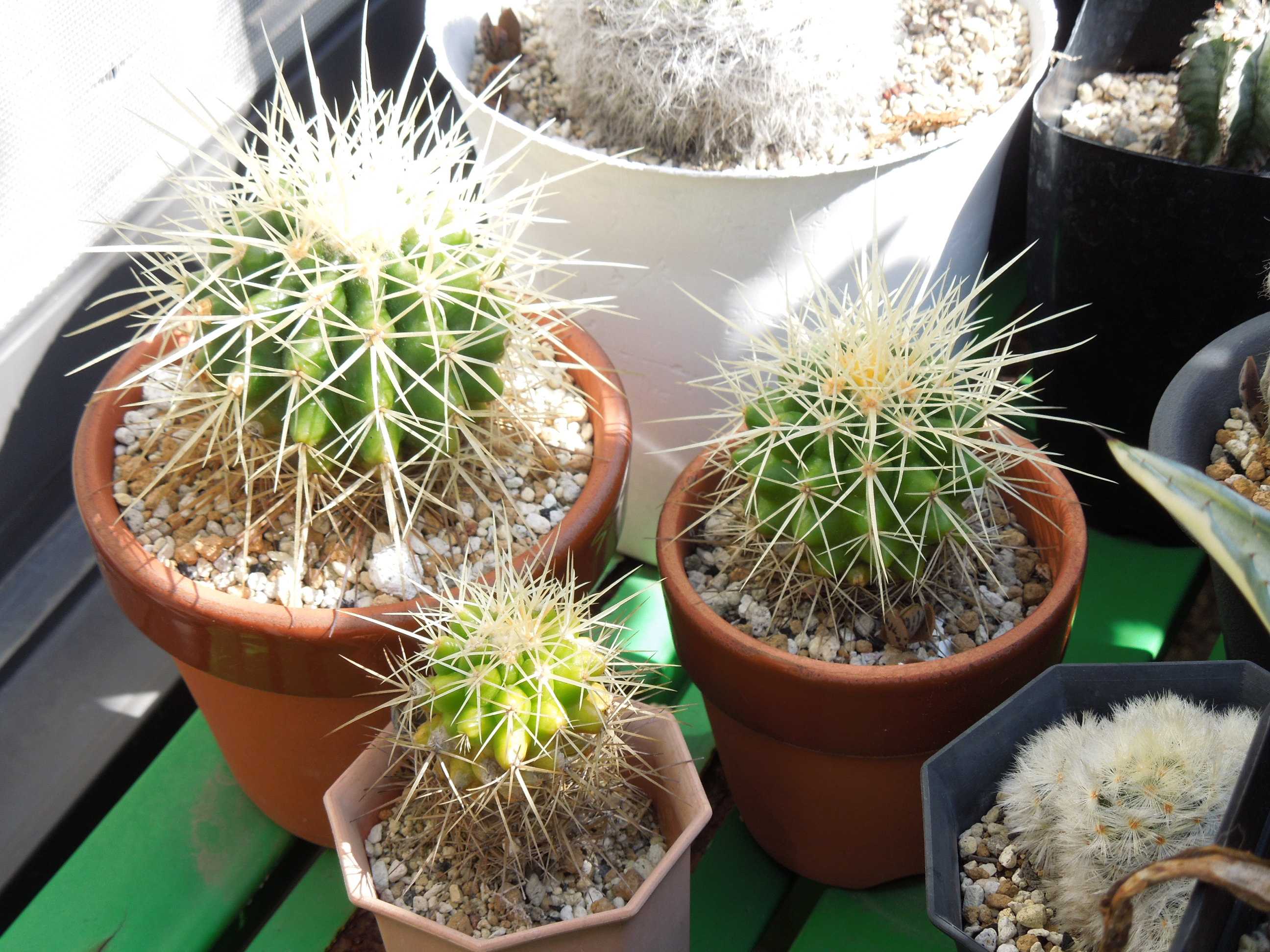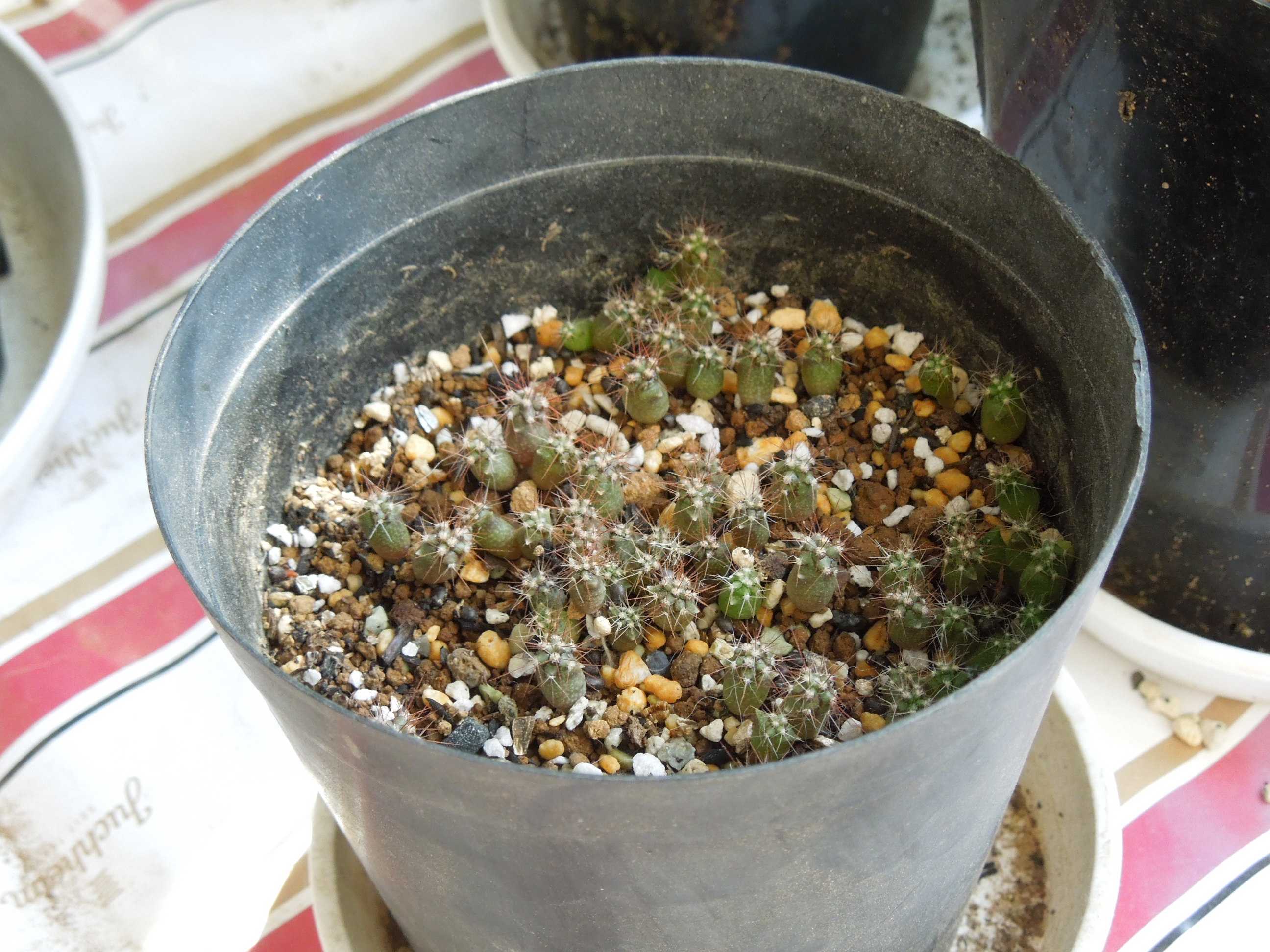 春に蒔いたバレーボールくらいの大きさの、名前を忘れたフェロカクタスの種子からの実生苗。