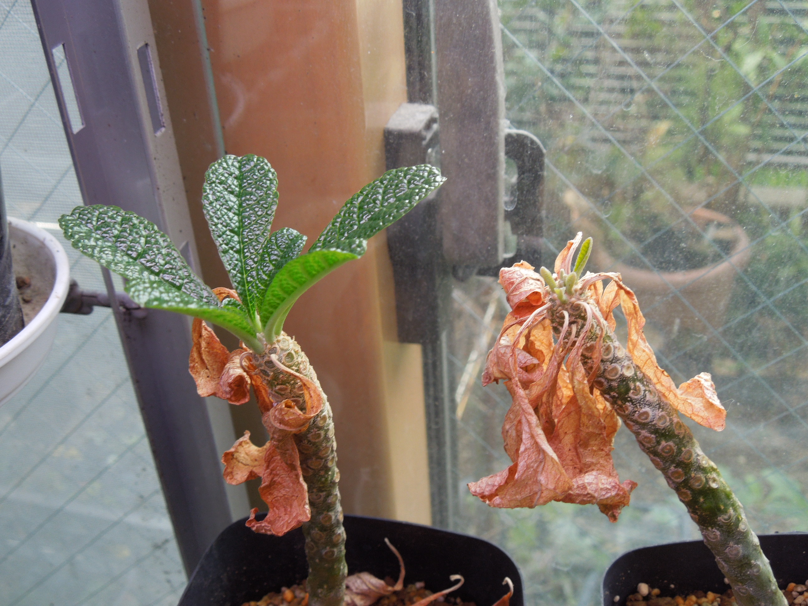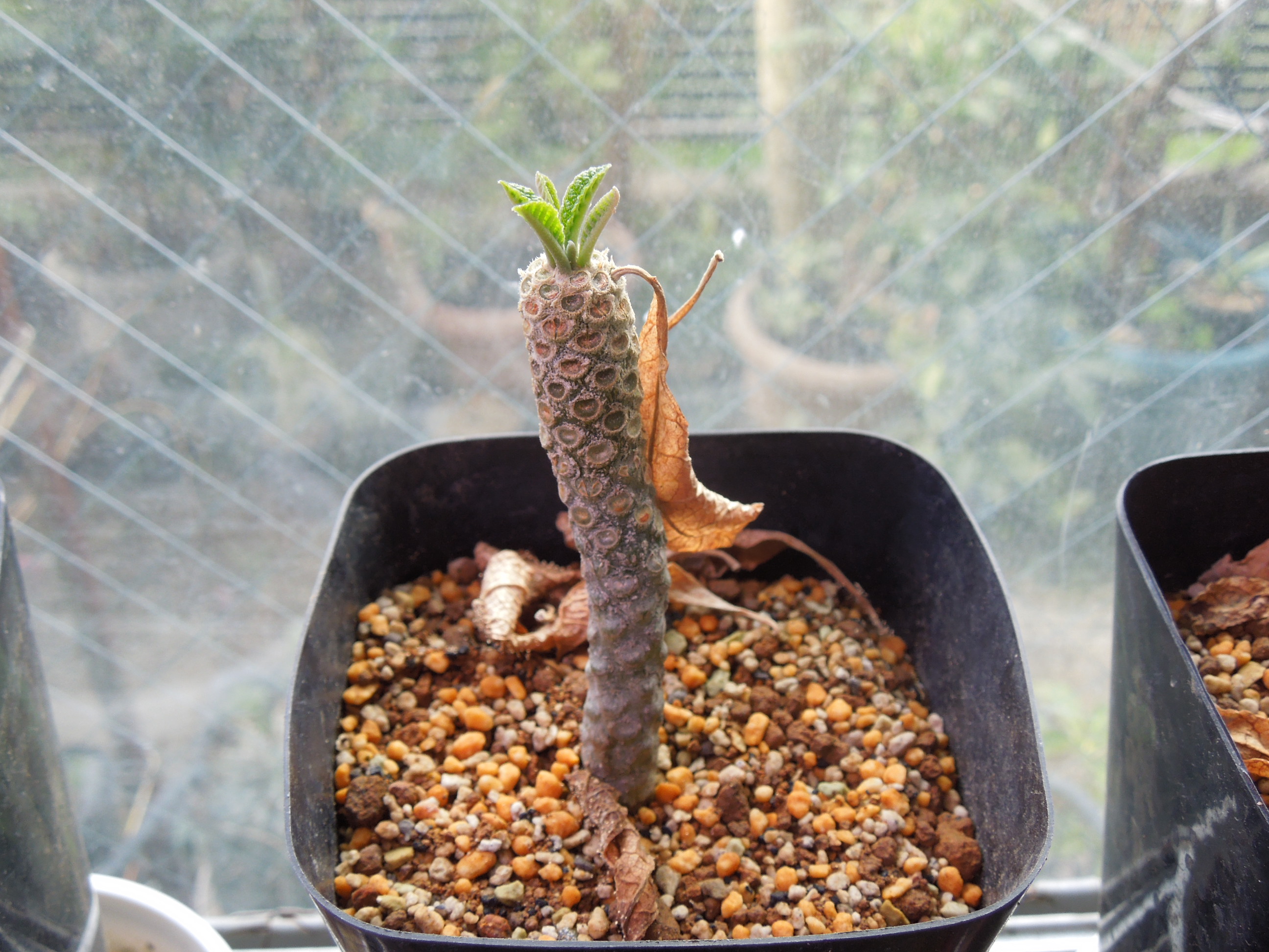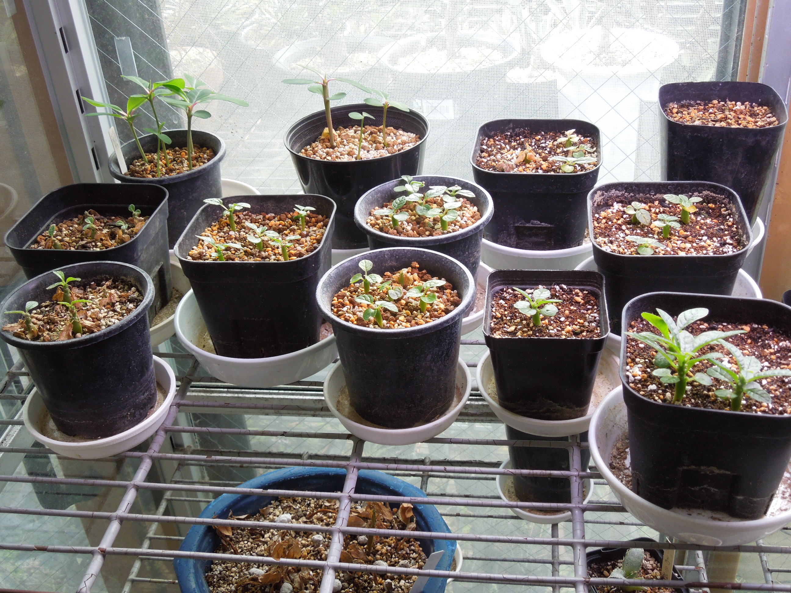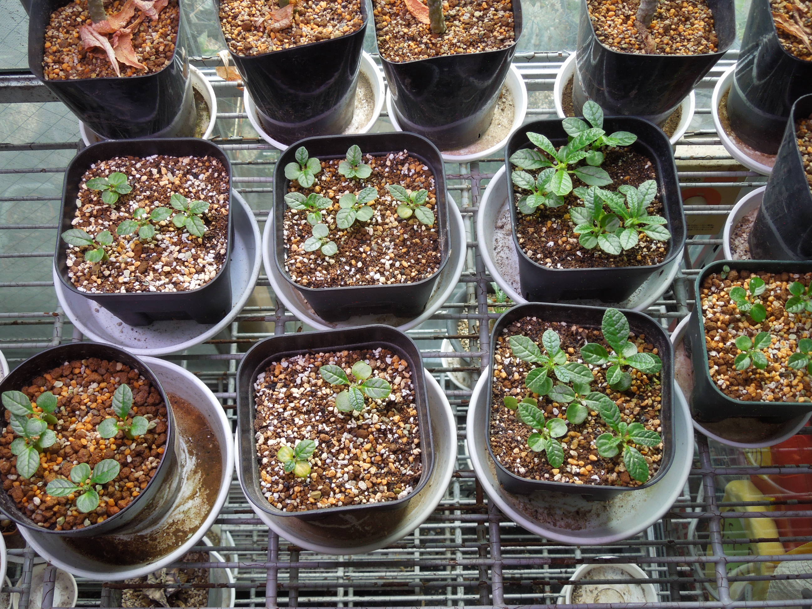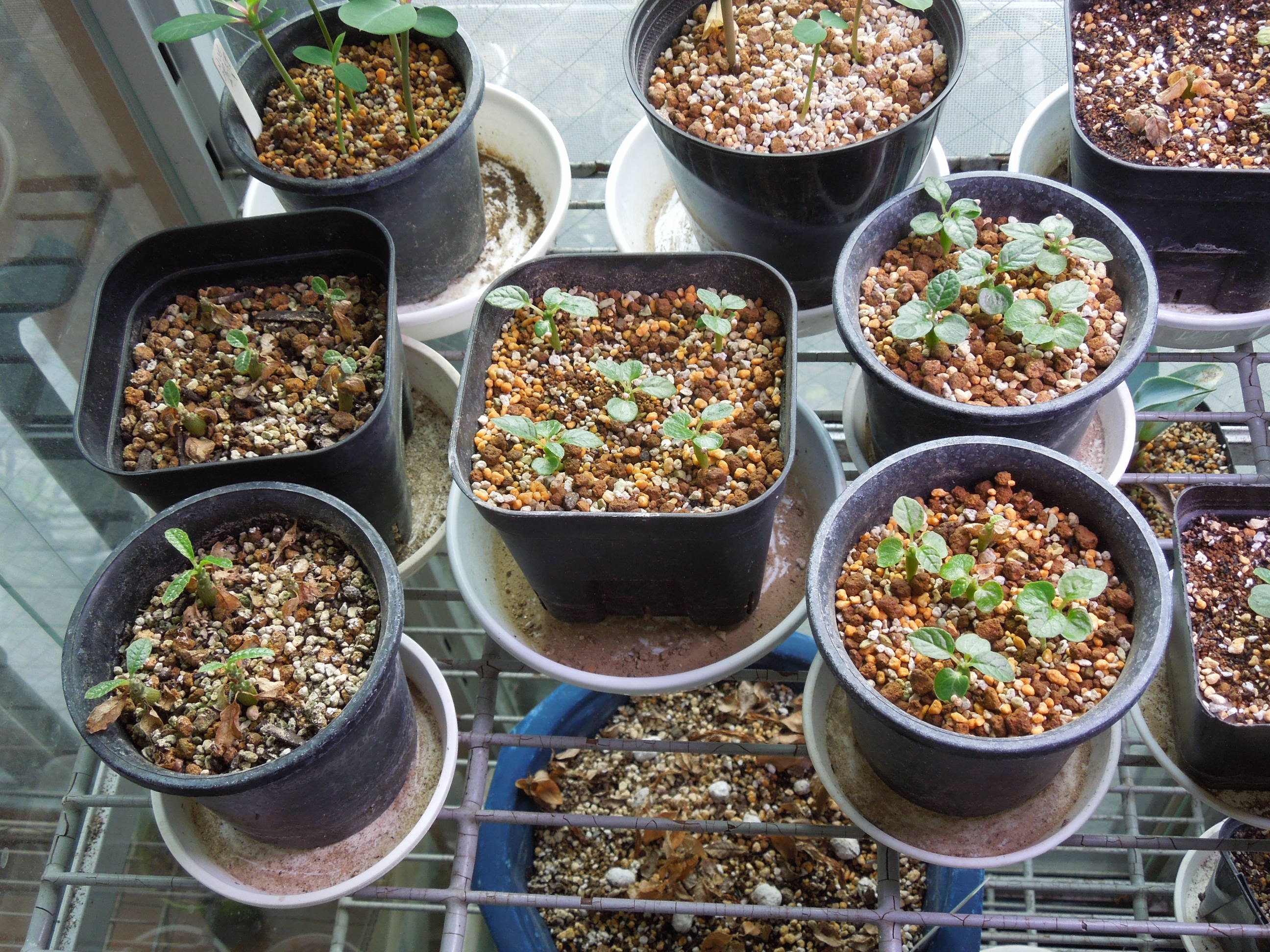 屋内用温室から出して葉を落としてしまった実生苗も、元の場所に戻したら復活。