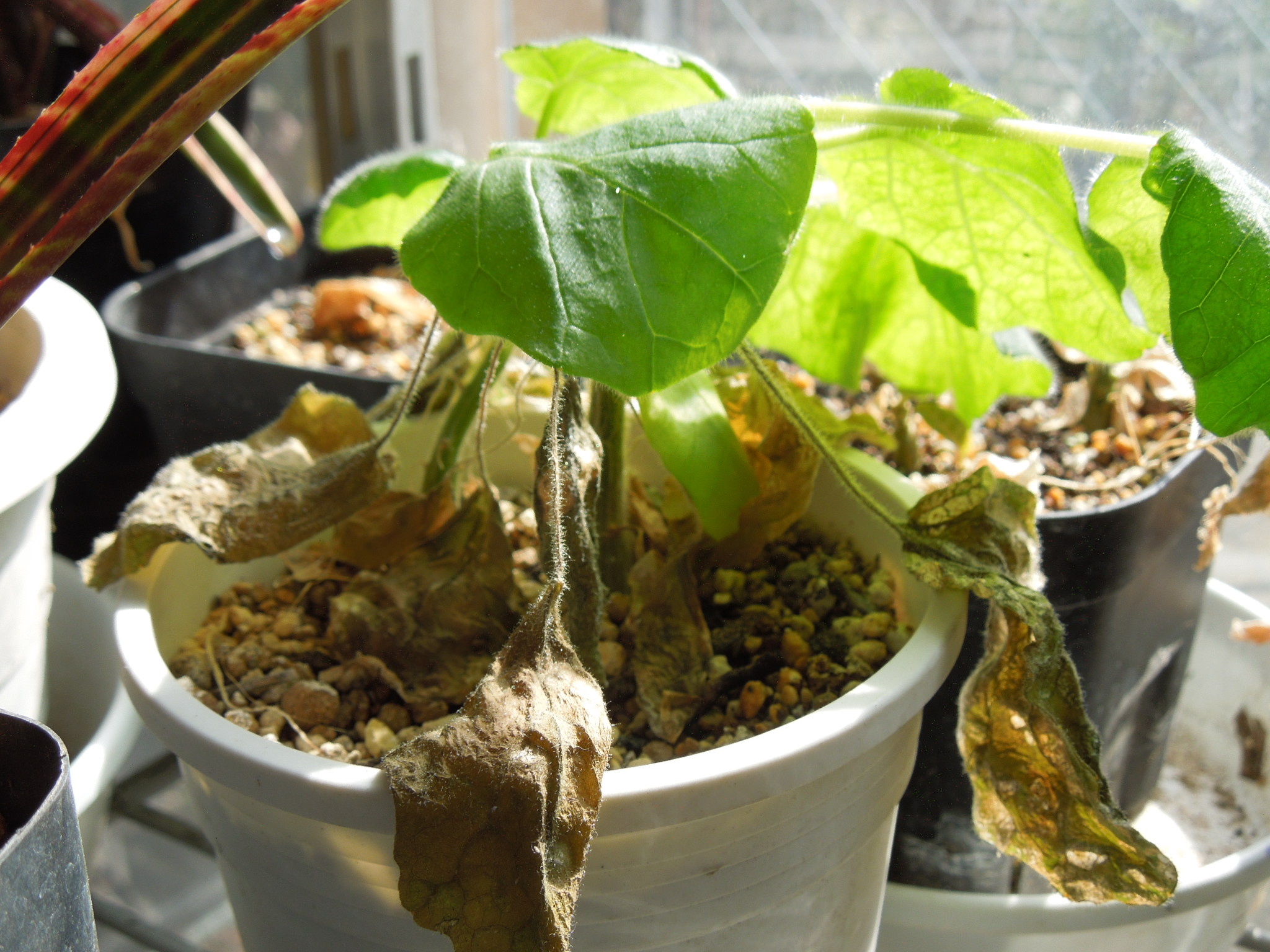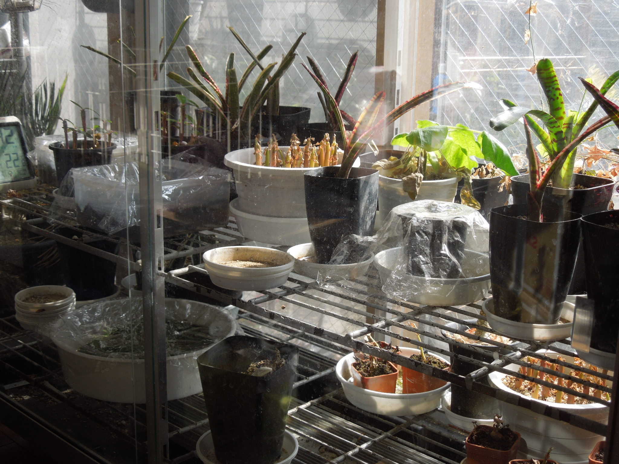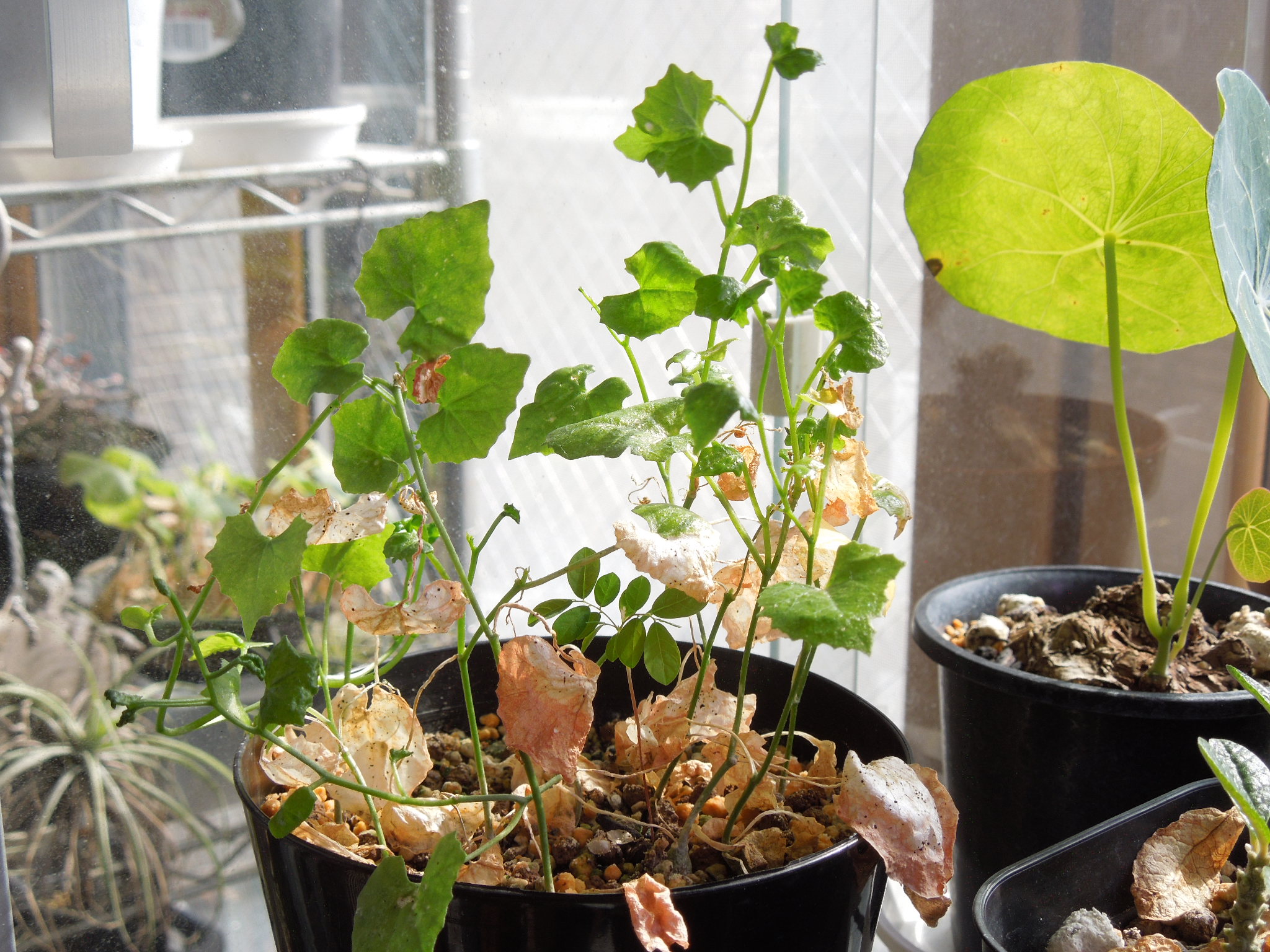 日差しの弱いこの時期、水が多いと徒長するので乾かせている。