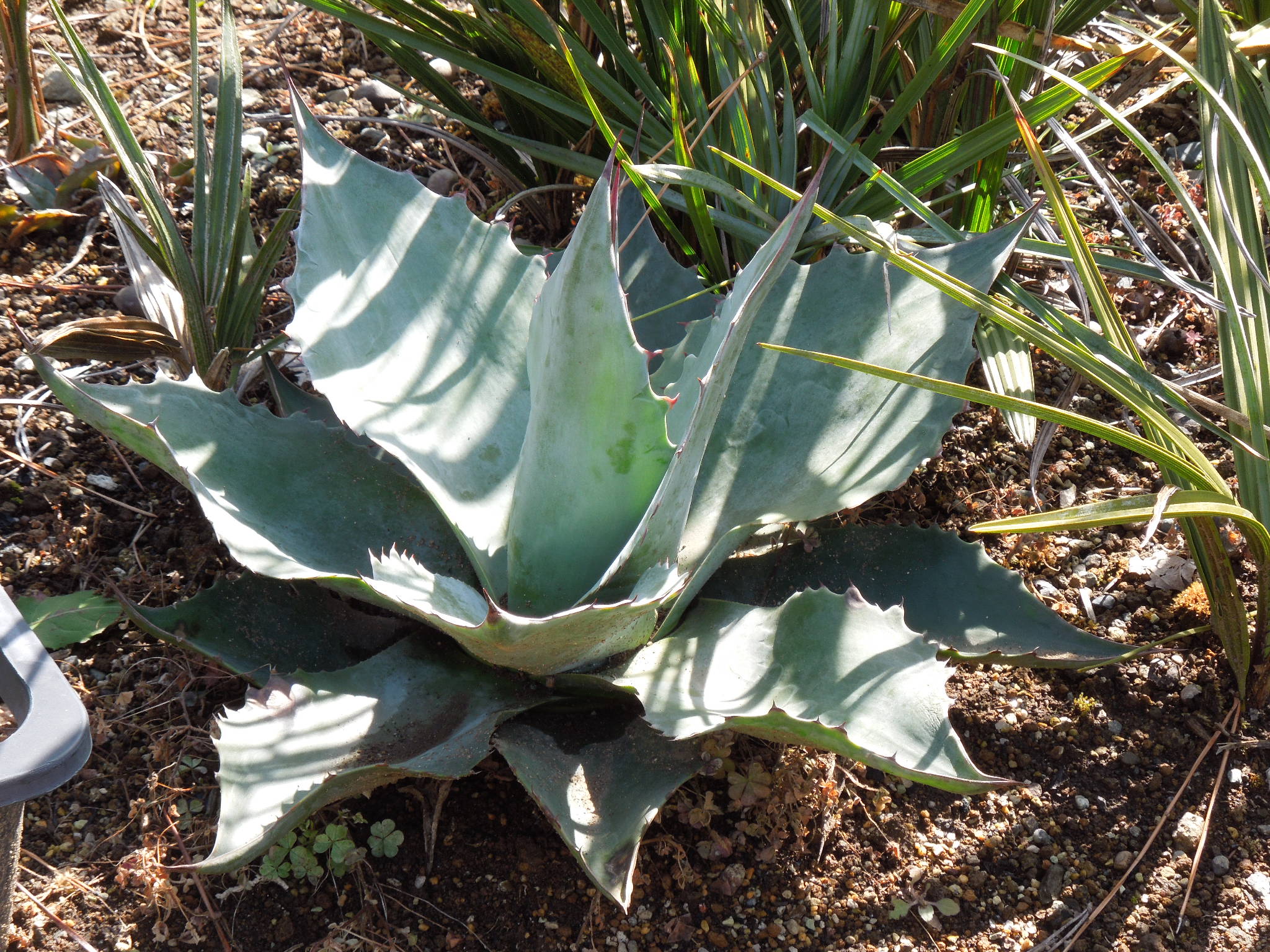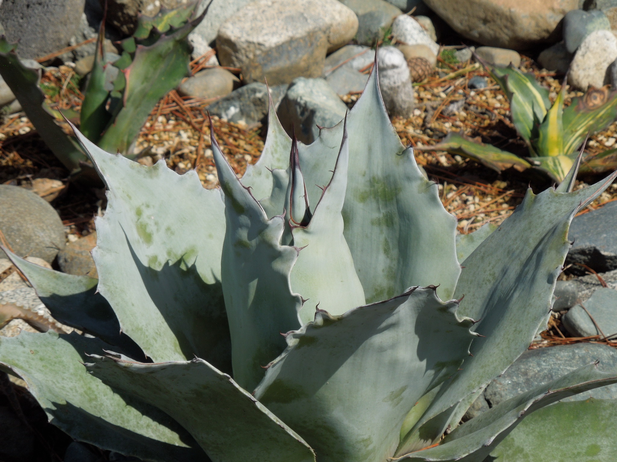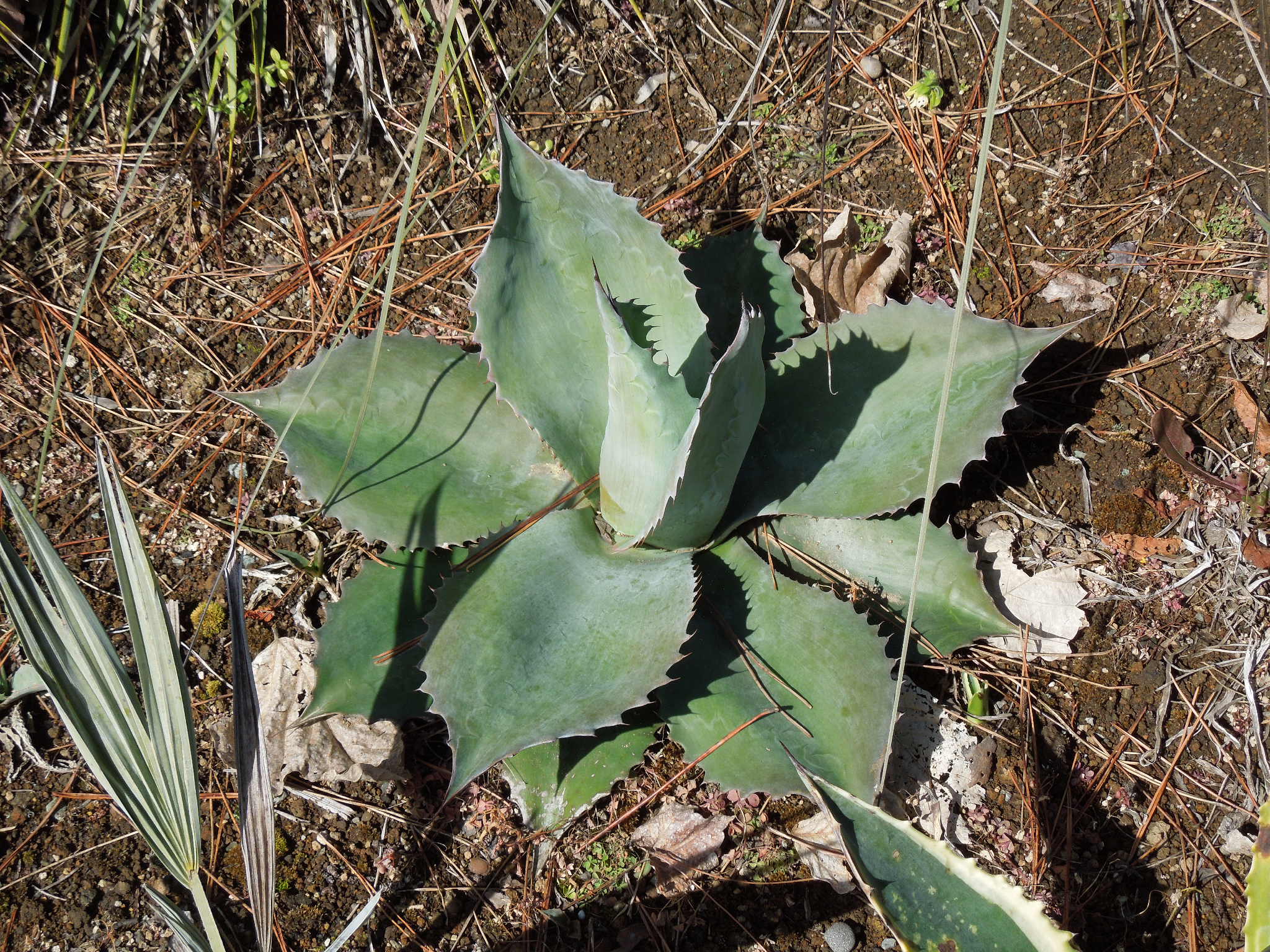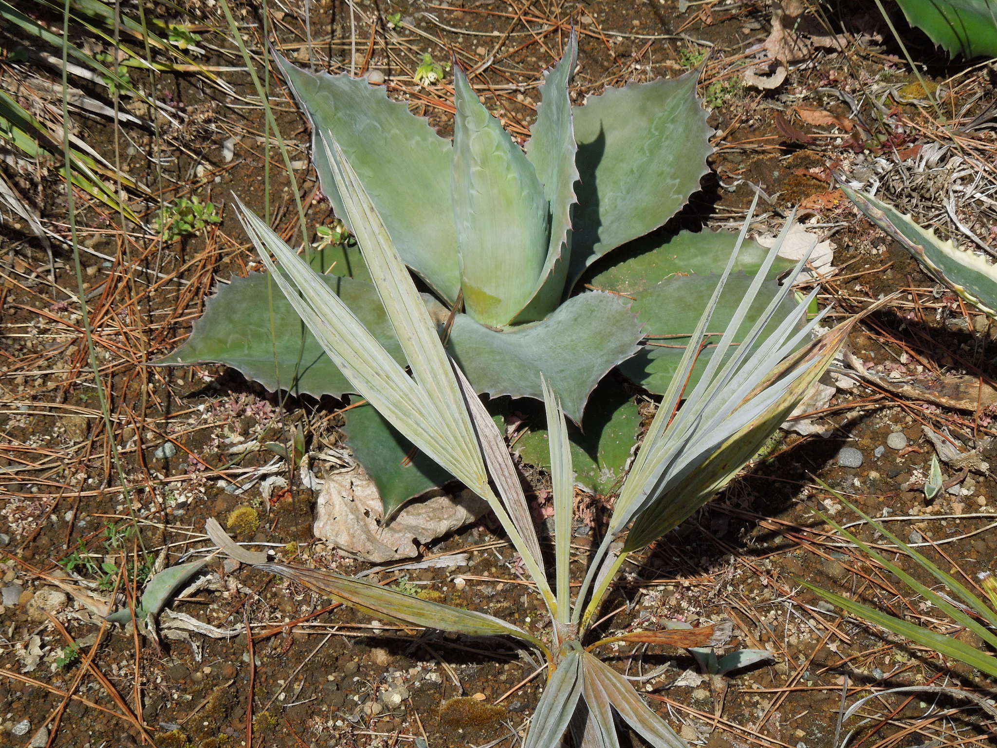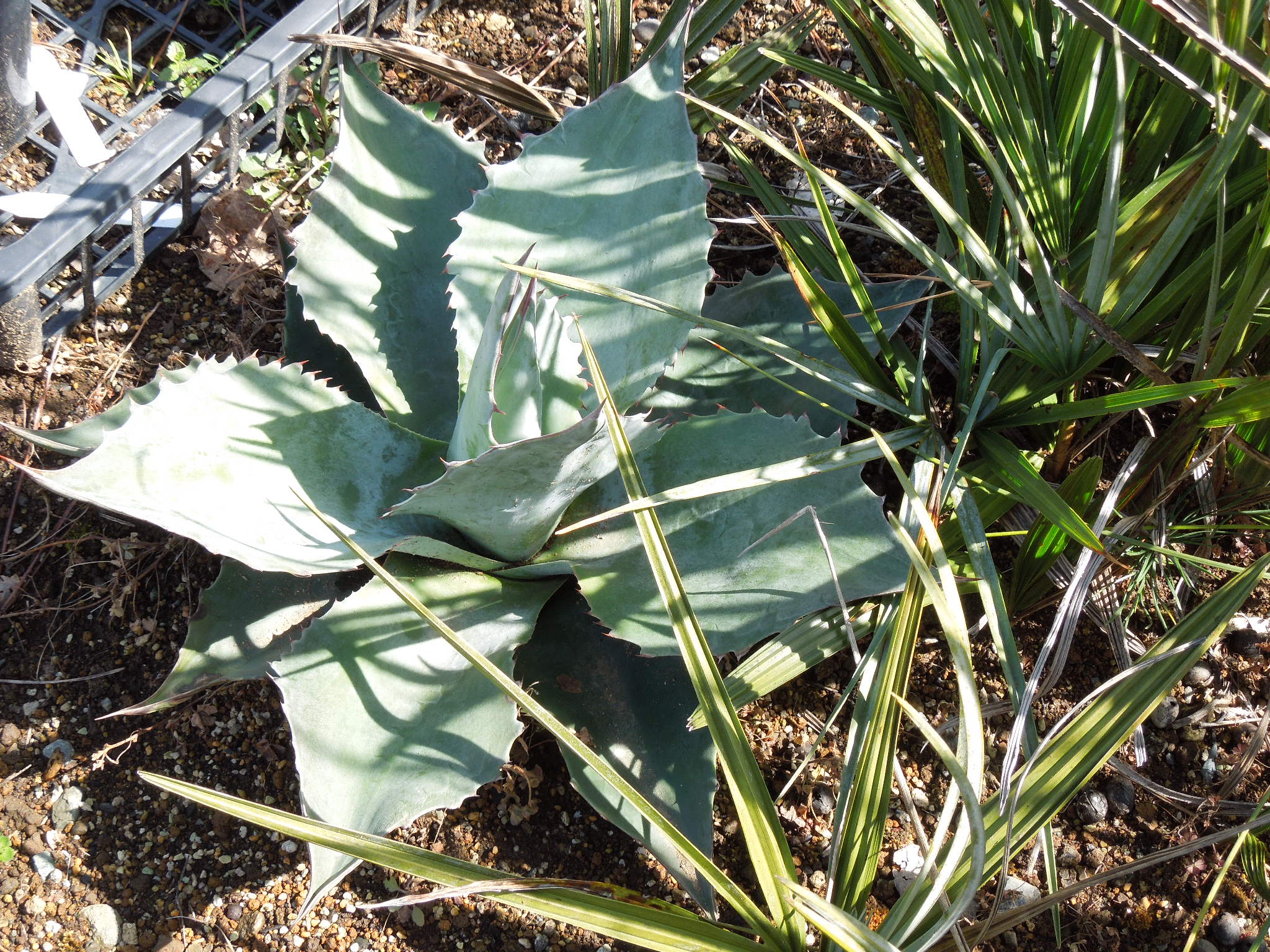 手前のチャメロップス・フミリス・セリフェラの葉の色と比べると、緑が強いのが良く分かる。