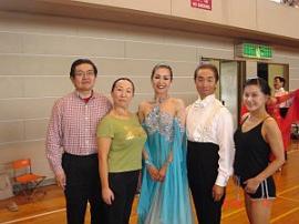 さて問題の3次予選(最終予選)はワルツのすっぽかしもなく、タンゴ、スローも気持ちよく踊ることができました。さなえちゃんが「クイックのスタートするときなんだけど谷村新司によく似た審査員と目があってにっこりほほえまれたよ!」って、で「僕らがスタートしたあとすぐにチェックをいれていたよ」って^^ですから踊りはふつうどおりに気持ちよく踊れてよかったとおもいます。え?じゃあとんでもない事ってなあに?って思うでしょう^^それはしばらく後の結果の事だったんです。なんとワルツ4点、タンゴ4点、スロー5点、クイック5点と20点満点で18点、なんと2位での準決勝進出っていうことです。これはとんでもないことです。ここでおばかな僕も変な計算が入ったんでしょうね!欲が出たというか・・・・・^^・僕は調子がいい・このままのいい調子で踊れば決勝に残れす可能性が大、・しかも上位にいる・5位以内に入れば1/2昇級の権利獲得・それこそスタンダードもA級にリーチ結果をみてさなえちゃんやおっくんに知らせに行くときにはもうすっかりほっぺたはゆるみ、笑いがこみ上げて来る感じ・・・・。もう有頂天^^欲ぼけ! こんな感じになった事ってありませんか?丁度そのころ焼き肉を食べに行っていたみつ・まき組とマタロー・うにこ組が焼き肉のにおいをぷんぷんさせながら会場にまたまた駆けつけてくれました。「まだ踊ってるかナー」「応援に来たよ」「えへへおなかすいてるだろ~~~~」「すごいじゃん、これでスタンダードもリーチだね」なんて言われて舞い上がっていました^^あはは^^ ↑焼き肉応援団さなえちゃんにも「そのまえ1点だったスローが5点満点ってどういう事なんだろう?、でもタンゴもスローも良い踊りだったよ」前回の福島でも点数の悪いときはだいたい高く浮いたというか地に足がつかないというか、そして上体のぶれた踊りを踊っていることが多いんです。ですからいつも低く低く踊るように心がけているんです。さていよいよ問題の準決勝です。決勝入りをめざし、A級リーチをめざして15組が踊ります。この時には変な計算や欲もわすれて低く低くこころがけて踊りました。あはは^^でもここでもワルツで同じところをついすっぽかしてしまって・・・・。「もうなれたわ!!」だって^^ 焼き肉のにおいのついた力強い応援の声をうけてワルツ・タンゴ・スロー・クイックと踊りました!結果はワルツ2点、タンゴ1点、スローに至っては0点、クイック3点で合計6点、10位で涙をのみましたm(_ _)mビデオを見て後でわかったことなんですが低く低くが逆に災いしてしまったようです。特に0点のスローではズンチャチャになってしまったというか、ぴょこぴょこした踊りって言うか、低く地を這う流れるようなスローができてなかったようです。まあこれも良い教訓になったと思います。簡単にA級になれるようじゃ値打ちもないし、ここで一度打ちのめされていい勉強ができたと思います。ところがこの後決勝ではもっととんでもないことが起こりました!なんと決勝に残った6組のウチの1組がいないんです・・・・。決勝に呼ばれても出てこないし、係の人達が控え室をあっちこっち探しましたが、見つかりません・・・。僕達代わりに踊りましょうか?って係の人に言ったんですが却下^^仕方が無く決勝は5組で踊っていました^^決勝に出ないんだったら準決勝にもでるなやーーー!って思いましたが、たぶん落ちたと思って結果も見ないでさっさと帰ってしまったんでしょうね!この日はラテン12曲・スタンダード16曲踊りました^^いやーー!つかれたなーー!つづく