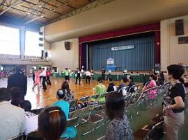 日曜日は第61回福島県総合体育大会ダンススポーツ競技にいってきました。そんなわけで今回もリーチのかかったA級に挑戦するB級ラテン戦と前回栃木で年度末昇級資格を勝ち取ったB級スタンダード戦に初挑戦です。結果がもう出ましたので、さきにご報告致します。B級ラテンは5位入賞、初挑戦のB級スタンダードはなんと準決勝という結果になりました。そして今回もマタロー&うにこちゃんと一緒になり面白おかしく過ごすことができました!会場は伊達郡川俣町体育館でしたので、電子地図帳で検索したところ、行程189キロとわりと近いのですが所要時間3時間とでましたので、受付8時半の30分前の8時に到着するように5時出発しました。ここ最近栃木遠征でなれている磐越自動車道、そして郡山からは東北自動車道を北上し、二本松インターから一般道路を約2~30キロ走ります。途中で何度かトイレ休憩をし、運転もさなえちゃんに少し交代してもらって到着予定時間の8時まえに目的地の川俣町体育館に着くことができました。 広くてきれいな施設で山のうえというか丘の上にあり、涼しい風が吹き避暑地のような感じのする体育館でした^^会場につくなりすぐにマタローちゃん達とお会いし、早速お土産交換^^ミッキーのストラップをいただきました^^話を聞くと3時に東京を出てきたそうで、2番めに会場についたそうです。 ↑控え室きれいな床にビニールが敷いてある武道場が控え室になっていました。シートをひいて衣装を洋服掛けにかけて一通り準備をして会場のほうに体を動かしに行きました。ところが2~3曲体を動かし出したとたん、どっとからだから汗が流れてきました・・・・。2~30分ほどパーツパーツの練習をし練習時間も終わりになりました。控え室に戻ったところ、開会式をやるから選手集まってくれと言うことで、普段着のままスリッパをはいたまま入場行進し^^開会式に参加しました^^スリッパの入場行進って^^あははですよね^^そんな訳で緊張もほぐれいよいよ競技の開始が近づいてきました。つづく