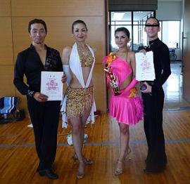 B級ラテンの決勝が始まります!そういえばマタロー&うにこ組とは3試合連続で一緒に決勝を踊るんですよね^^!これも楽しいですよね^^いよいよゼッケンと名前を呼ばれ決勝のフロアーに入場しました。決勝でも若者と離れた場所からスタートすることができました。サンバ、チャチャチャ、ルンバ、パソの4種目は自分でもよくおどれたと思います。ところでいつも疑問に思うのはこの4種目の順番なんですが、統一級のJDSF・JDC・JPBDAの各団体ではサンバ・チャチャチャ・ルンバ・パソの順番なんですが、JBDF(財団)ではチャチャチャ・サンバ・ルンバ・パソの順番なんです。チャチャチャとサンバの順番が変わるんですが・・・・これってなんで?知ってる人いませんか?精一杯おどりました^^足上げもまあまあ^^おおきな拍手を受けて退場しました^^ ↑あんまり良い写真が撮れていませんでした・・・。さて少しの後表彰式が始まります。ここ、長野の大会は最下位から呼ばれるんですね^^ですから呼ばれないように呼ばれないようにって思ってましたが、結果は3番目に呼ばれました^^ということで4位です。 ↑マタローちゃん達と記念撮影マタロー組と仲良く記念撮影を^^^ここまで12曲をフルパワーで踊って、さすがに疲れるんですが、でも前回の福島ほどではありませんでした。あのときはビデオのスイッチを切り忘れるくらい披露困憊だったんですが・・・・でも控え室に戻り2~30分くらいアイスノンを枕に少し横になりました。湿度がわりと低くて気温もそれほどでもなく、しゃべったり動いたりできるくらいでしたから^^(なんか病人みたいね^^)新潟のT組からは午前中に思いっきり力を使い果たしてね!!なんて言われていましたが、アイスノン首筋作戦大成功でしばらくして元気もりもり復活です^^ただ、練習時間がほとんどとれませんでしたのでフロアーの脇で一番気になるワルツのスピンのあたりを何度もふたりで調整したりしていました^^僕達より先に1級戦にでるおっくん達やC級戦のあっぷるじゅうすさんの出番があり、ゆっくり見ることができました。おっくん達もあっぷるじゅうすさん達もまずますの踊りを踊っていました。そしてミツ・マキ組やマタロー組と一緒になってあっぷるじゅうす組を応援しました^^これも楽しいですね^^そしていよいよB級スタンダードの1次予選です。僕達は4ヒートの第3ヒートで踊ります!ここで56組から36組に絞られます。どこからスタートしようかとあれこれ考えてワルツは奥の方からスタートし、審査員の前で見せ場のルーティンが来るようにしましたけど・・途中でぶつかって・・あんまり関係なかったかも・・・。別のヒートを見ているとやっぱりB級だわ、みんな上手いんだよなーーーー!僕達ちょっとでも気を抜いたり、ぶつかって全然動けなかったりするとすぐに落ちるんだろうナー・・・・!って^^タンゴ、スロー、を踊り最後は得意のクイックです^^クイックでは以前に楽天TKさんの奥さんから「前半部分をもっとスピードUPで踊るように」ってアドバイスをもらった通り外周を以前よりスピードアップして思いっきり走り回りました^^ここでもみんなから大きくゼッケンを呼んでもらい、応援していただきました。彼らはこれから焼き肉を食べにいくそうで、さよならを言ってお別れしました^^1次予選の結果は20点中クイックが満点の合計16点で中位で2次予選に進出することができました。つづく