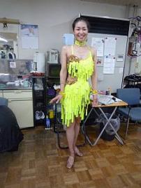 先週の水曜日のレッスンの時にダイアナのカタジナさんに教室まで来てもらってニュードレスの打ち合わせをしました。ダイアナっていうオーダードレスメーカーはカタジナさんっていうプロのダンサーがやっていてでカーシャという名前で試合にも出場しています。そして今度仙台にお店を出すそうです・・・^^そして1週間後の今日、仮縫いということで、またまた教室まで来てもらって、更衣室で仮縫いをしました^^ ↑とりあえず仮縫いの状態^^さなえチャンのドレスは全部にフリンジがつきます^^確か昨年のカレンダーにあったようなデザインなんですが、レモンイエローに少しヒョウ柄が入ります^^僕のはだいたいこんな感じで、上のレモンイエローに焦げ茶のパンツ^^その後、石が適当につきます^^来週にもできあがるそうですが、凄く楽しみです^^