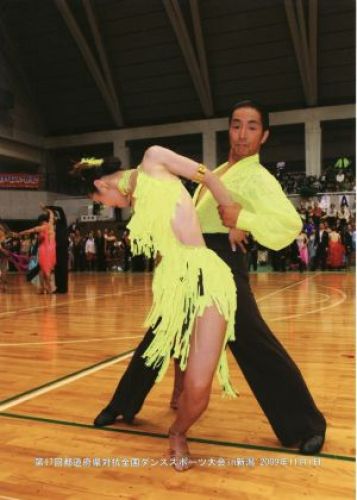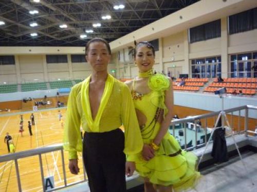 結果的に準決勝に進出出来ましたけど、内容はひやひやでした・・・・ そんなわけですから早苗ちゃんに結果を伝えに戻るとホントに心配してたみたいで、大喜びでした^^ アップルリーダーのカズ君がちょうど僕たちをビデオ撮影しててくれて、踊りを見せてもらいましたけど、やっぱりチャチャチャがバタバタしててひどかったです。 ちょうど隣で踊っていたStartreesさんの動きがすばらしくて、さすがにうまいな~~って二人で感心していました。 約1時間の後準決勝が始まります。 今度は1ヒート12組で踊りますので4曲連続になります。 以前でしたら、全然スタミナは問題なかったんですが、病み上がりですのでそこが一番問題になりそうです。 さてさて問題の準決勝が始まりました。 さっきと少し場所を変えてチャチャチャはなるべく真ん中付近に陣取ろうとしましたが、結局端っこの方になってしまい・・・ まあ、それでもさっきよりいい感じで始められたと思いましたが、二人の絡むところで失敗・・・・・二人のタイミングがあわず・・・・ 次のサンバはもっと悲惨でした・・・1週目が終わり2週目に入ったところでスタミナが切れて・・・・思いっきり動けなくなりました・・・ 息もハアハア・・・・ それを引きずって始まったルンバでは、最初のスライディングドアーで足がもつれてフラッ・・・・見た目にはぐらついた感じは見えなかったかもしれませんが、足元が弱く・・・エンガチョでした^^ ついでに足上げの僕のポーズがつぶれちゃって(男らしさがきえて・・)・・・見れなかっただろうな~~ 最後のパソもたぶん勢いが消えて・・・・・いまいちだったと思います。 4曲踊り終わって引き上げてきたときには、地べたに座り込んで息も絶え絶え・・・・・・こんな様子じゃどうにもなりませんね・・ 水分補給してやっとの事で普通にしゃべれれる様になったのは4~5分たった後でした。 結果は案の定、準決勝どまり・・・・・それでも8位でした。 折角だったので決勝踊りたかったのですが・・・・フロアーに立ったとしてもへろへろだったと思います。 でも病み上がりで準決勝に残れるかどうか心配しながらの初戦でしたので、上出来です^^ あとはスタミナをいかにつけていくかということが一番の問題になります。 ↑黄色い衣装 ところで久しぶりに着た黄色い衣装はウエストがピチピチ!横っ腹がポニョポニョ! 正解かどうかわかりませんがとりあえずスタミナ重視&法事で妹家族と喰いっぱなし週間のつけでしっかりと太ってしまってしまいました。 あとはスタミナを増やしながら、体重を減らし、おなかのポニョポニョも減らすことにします。 つづく