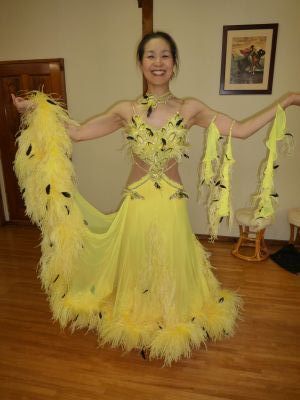 翌日早速新しいエンビと・・・・・・新しいドレスで練習・・えへへ^^実は前に激写した黄色いドレス・・・さなえちゃんは気に入って買っちゃいました^^そんなわけで、1日はニュードレスとニューエンビのデビュー戦になります^^ですから・・ドレス練習^^ところがタンゴでだめ出しの嵐・。・・・・・デビューする前から汗いっぱいかいちゃいました・・・踊る度に黄色い羽がプチプチと音がするんです・・・ボクが踏んでるみたい^^ということは裾が長いかも・・・あとで靴を磨こうとしたら・・・なんと・・・・黄色い羽がいっぱい靴の底にくっついていました^^フロアーを見ると黄色い羽がいっぱい・・・なんか養鶏場みたいなかんじ・・・・・鶏が運動会した後のような・・・・・あとで掃除しますね^^