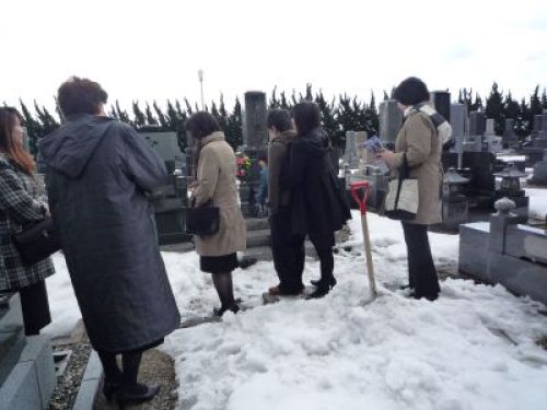 朝の10時から母の一周忌の法要が始まりました。出かけるときにはぱらぱらと雨が降ってましたけど、お経が終わり、一周忌の法要が終わったときには雨も上がって晴れ間も見えていました^^さてそれからお花を買ってお墓に向かいます。新潟市の外れにある太夫浜霊園ですここは競馬場インターの海側にあり、市営の霊園ですから宗派も関係なく、いろんなお墓があります。以前にも書いたことがありますが、おおきなモアイ像があったり、キティちゃんの石像があったり・・・・昨日新たに見つけたのはわんちゃんの石像でした\\ちょうどお墓の前に雪も残っていて・・・・車に戻りスコップを持ちだし・・・・雪かきを久しぶりにしました^^雪の墓参りもおつなもんですね¥¥↑雪の墓参りでも天気もよかったのでいい感じでしたけど・・・一月前の大雪の時期だったら、厳しかったですね・・・ちょうど12時に予約していた寿司屋の2階で、宴会が始まりましたまあ、宴会といっても子供たちが主役でして・・・・久しぶりのいとことの再開で騒いでいます^^↑お料理僕はあんまり食べられませんでしたけど・・・・みんなほとんど平らげて・・・・おなかいっぱい^^母も楽しそうに見ていたことと思います^^おしまい^^