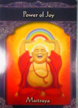 お正月バージョン何がまっているのかな~わくわくリリーさんのレイキ勉強会に参加してきました。 お互いの近況報告をして(私はケニア話をきいてもらいました)霊授、トレーニング、レイキマラソンとほんとに体がぽかぽかして、温泉につかったような気分。レイキをしていただいてる時などマジで寝てしまいましたとーっても気持ちよかったです。 そしてお正月バージョン登場!マンダラの塗り絵☆規則性もバランスも何も考えずに塗ってみたら…こんな感じになりました(つづきは家でやりますよ)やっているときは無我夢中で気づきませんでしたがすべての色を使っていました。おお!これはアフリカの極彩色に通じるものがある(笑)知らず知らず今の心境が映し出されているのかもしれません。おもしろい引きだしをもってますね、リリーさん。 紅茶とケーキをごちそうになりながら(食べるのに夢中で写真なしきゃ~)アセンテッドマスターのメッセージカードを引きましたら…こんなん、出ました!!!引くなり、笑っちゃいます。こんなカードあるんだーーーとリリーさんと二人で大爆笑。新春にぴったり、福笑いということで。。。 Power of Joy 喜びのパワーますます楽しく今を生きていこう!と思いました。 ありがとうございました