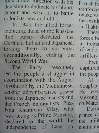 「ロシア赤軍を含む連合国が、ドイツ、イタリア、日本を無条件降伏させた」とか、「ラオスは、ファシスト日本から独立を取りもどした」という書きぶりがあります。
