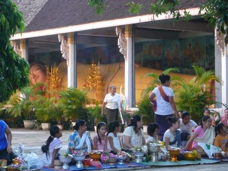 ゴザを敷いて、お坊さんにお布施をするための席取りをしています。