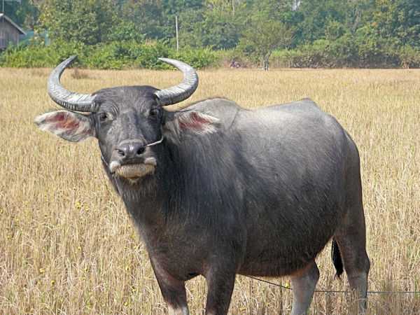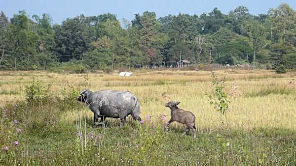 水牛が牧草地で自由に草を食んでいることもあります。紐に繋がっていることもありますが、自由に動き回っていることもあります。子供の水牛が親の跡を衝いて跳ね回っている姿は、とても微笑ましいです。
