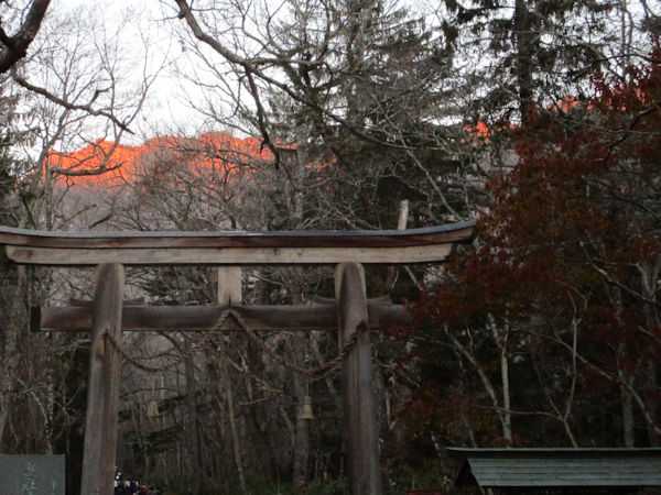 2 枚目は、奥社参道入り口から見た朝日を浴びて真っ赤に染まった戸隠山山頂。
