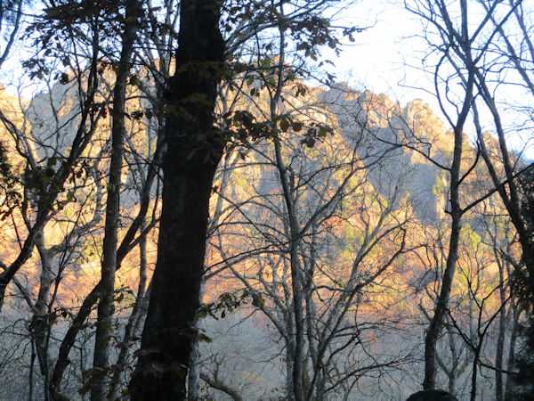 3 枚目は、奥社参道参道付近から見た朝日を全身に浴びている戸隠山。