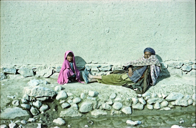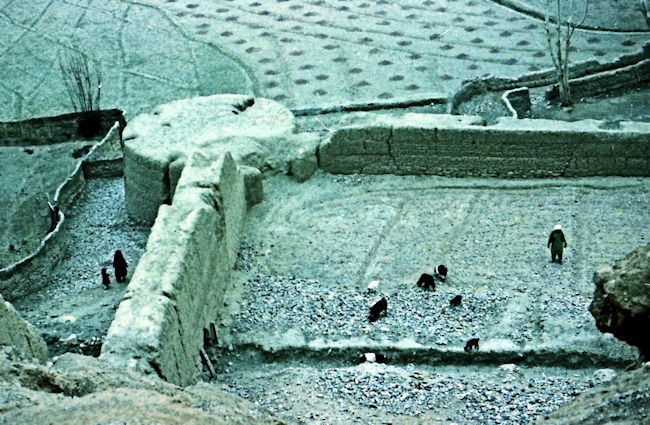 写真は、村の建物、城壁のような建物、日向ぼっこする子供と大人、子供とロバとラクダ、