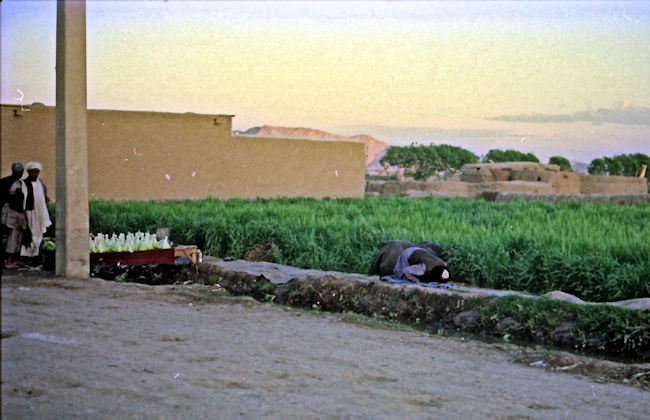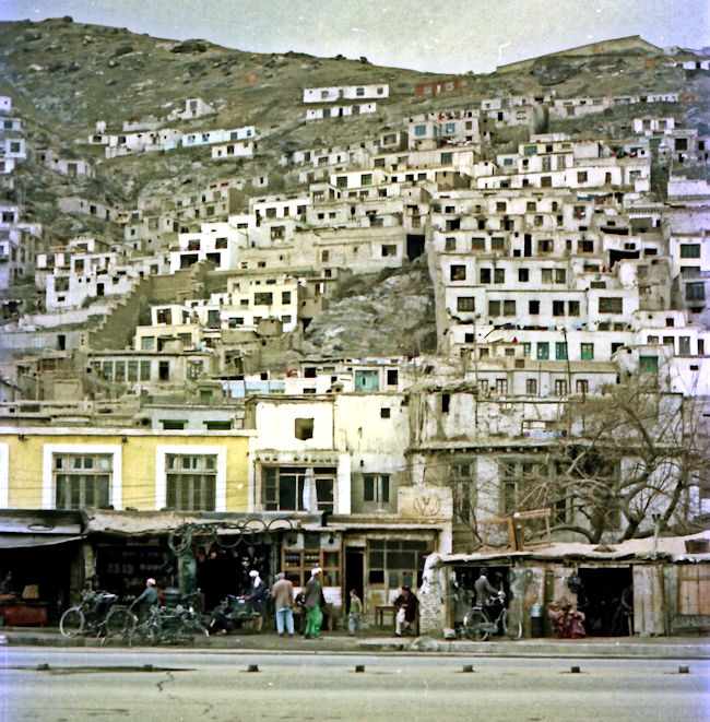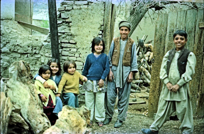 写真は、 1977 年の景色で、荷物を運ぶロバ達、岩山にへばりつく家、岩山で出会った子供達、岩山から見たカーブルの町、畑の畔の上でお祈りする人です。