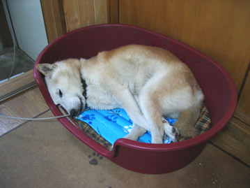 昨夜は蒸し暑かった~。。。私でも蒸し暑いんだから屋内で過ごすことになれていないゆうたには 相当暑かったようで。夜中に何度も起きて寝場所を変えてました。そのうちに やたらとへえへえ息づかいが荒くなってきたのでこりゃヤバイぞっ!!ってことで 急きょアイスノンをベッドのマットの下に入れたやりました。今朝見たら アイスノンを抱えてぐ~ぐ~寝てました。爆睡も良いところで 何やっても起きないし夢見て走ってましたよ。でも今日はちょっと涼しいので すぐに取り上げましたけど。暑いのも冷え過ぎも良くないのよ~!今からこれじゃあ 本格的に暑くなったらどうしましょう?ゆうた専用扇風機を用意するか?やっぱりクールマットを買うか?いろいろあるけどどれが良いの?買ったところで使ってくれのか!?