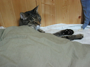 寒くなると寝る時の楽しみが増えます。夏でも大概一緒に寝てるとはいえ冬の方が愉しみが多いのがねこ行火 です。私のベッドは電気毛布が入っているのでこまの行火の役割は薄いしどっちかというと ベッドはこまのベッド だと思っているらしいので行火の役割は私なんじゃないかと思うくらい。。。だったんですがぁ。。。私が家に引きこもるようになったせいかベッドの所有権を取り戻せたようです。今までふたりで寝る場合は こまと私で半分ずつ。もしくは こまが真ん中私は端っこ という割合でした。ところが今年は違うんです。私のベッドは西枕で置いてあり私とこまはふたり仲良く枕を並べて寝るのが通常でしたが気が付けば こまが反対側で寝ているようになりました。こまが東 私が西。そう 領地分割と相成りました。こま用枕を東領へ移動させなくてはいけないようです。