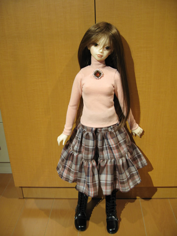 風邪、悪化中。咳が止まらなくなってきました。あちゃ~。。。( ̄Д ̄)とか言いつつも、今日も今日とて、橙子さんのお洋服作り♪ティアードスカート作ってみました。買ってきた布地は二重ガーゼのチェック柄。始めにな~んにも考えずに裁断してしまい、はたと気が付けば、「これって柄合わせしなくちゃいけないんじゃ~ん。。。il||li _| ̄|○ il||li」ってことで、3枚はぎになっている3段目だけ裁断し直しに。もちろん布も足りなくなったので、20cm買い足す羽目になりました。言っても、メーター300円だからね。。。(爆)かわいいのが安いのってステキ☆ギャザーをいかに均等に寄せるのかとか、縫い止めるのかとか、悩んでいましたが。やってみたらば、あらまあ。。。ミシンが勝手に良い感じにギャザーを寄せてくれました。楽チンしてしまった( ̄∀ ̄*)ミシンのスピードもだいぶ早くかけられるようになりましたよ。直線とか、裁ち目かがりくらいなら、だだだだだ~~~~っと、軽快に進められるようになりました。そんな感じで出来上がったスカートと、前に作ったタートルネックを着せてみました。胸元には、何年も前に作った淡水パールとスワロのブローチを付けてみました。アクセサリーもたくさん作ってあげなくちゃね。