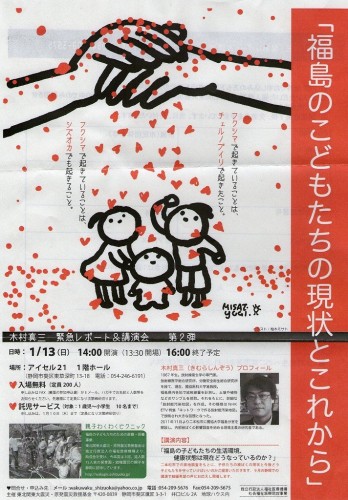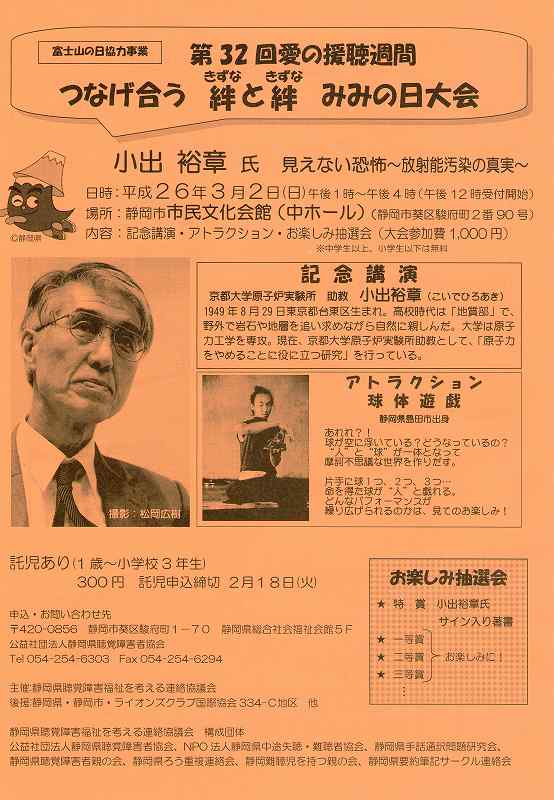 思えば、前回小出先生の講演会に行ったのは、東日本大震災から間もない2011年4月のことだった。福島第一原発の事故は一向に収まらず、刻々と伝えられる「放射能汚染のニュース」のなか、はりつめた緊張感とともに、小出先生のお話しを聞いたのだった。その内容については、7回に渡ってこのブログでも紹介しているので、興味のある方は、こちらをご参照ください⇒小出裕章氏講演会あれから間もなく3年が経とうとしている。「原発0」を願う人にも、「やはり原発は動かす必要がある」と考える人にも、「何だかよくわからない」と思う人にも、放射能やエネルギーの問題は、等しく降りかかる。自分や子ども、そして孫の未来にまで関わってくることに対して、考えや態度を決めるためには、まず「現実」を知って「知識」を得ることが必要だと思う。“知らないふりをして、後から誰かに責任を取らせることはできない”と、3年前の事故で思い知ったはずだ。「小出先生の言っていることが絶対!」だと言うつもりはない。でも私は、できないことは「できません」、わからないことは「わかりません」と言う人を信じる。そういう意味では、小出先生は信じるに足る方だと思うし、今までのお話を聞くかぎり、人をコントロールしたり、自分の考えを押し付けようとしていると感じたことはない。ただ、一心に人の幸せを願い、学者としての立場から自分の知識、情報、見解を伝えようとしているのだと思う。今回「みみの日」の大会の記念講演として、小出裕章先生が、静岡に来てくれることとなった。主催者によると、日本中で引っ張りだこの小出先生を呼ぶのは、本当に大変だったそうだ。お知らせが遅くなってしまい、託児の申し込みには間に合わず申し訳ないのですが、ここに開催の案内をいたします。「第32回愛の援聴週間」“つなげ合う 絆と絆 みみの日大会”記念講演 「見えない恐怖~放射能汚染の真実~」講師:小出裕章氏 京都大学原子炉実験所 助教日時:平成26年3月2日(日) 午後1時~4時(12時受付開始)場所:静岡市民文化会館 中ホール(静岡市葵区駿府町2-90)参加費:1,000円申し込み・問い合わせ:公益社団法人静岡県聴覚障害者協会〒420-0856 静岡市葵区駿府町1-70 静岡県総合社会福祉会館5F電話:054-254-6303 ファクス:054-254-6294※当日は「静岡マラソン」が開催されているため、午後12時まで 駿府城公園周辺が通行止めとなります。