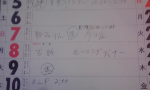 最近、母にはお気に入りのものがある。それは、ファミレス「ロイヤルホスト」の朝ごはん。ほぼ、納豆と海苔&漬物で朝ごはんを食べている母を妹が「たまにはモーニング食べに行こう!」と誘ったのがきっけだった。母は、ファミレスのメニューの多さと、鮮やかな色、珍しい食材に驚きまくり、、特に、アサイーという果物とヨーグルトのセットが気にいった。それで、友人を誘いたくなってメールをするため、私達に確認してきた。「あれは、モーニング何って言うのかね?」「何って…、ただのモーニングだよ」と答えても納得しない。「そんなことないよ。モーニングの後に何か付くでしょ!」と、しつこく聞いてくる。どうやら「モーニング」だけだと『朝』という意味になってしまうと思っているらしい。だから、 「ただのモーニングだってば!」 と何度答えても、「ふぅ~ん!」 と納得いかないのだ。それでも、やがてカレンダーに次のファミレス行きの予定を楽しそうに書き込んでいた。で、それを見たら… ん???? えぇー!