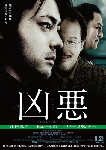 どの仕事にも、何かしら「役得」というものがあると思うけれど、私の場合、大好きな「映画」を公開前に見ることができたり、たまにだけれど、役者さんや監督にインタビューさせてもらえることが嬉しい。作品のできた経緯や裏話、苦労話、そしてこだわった所など、いつもワクワクしながら聞いてしまう。それで、今回も上司に「映画の取材だけど、行く?」と振られた時、「ハイ、ハイ! 行く、行く!」と二つ返事で手を挙げた。しかしよく聞いてみれば、作品名は 「凶悪」何ぃ!? このリリー・フランキーの顔。これだけでも、「こ、恐わそう…いや、ぜったい怖い!」と確信する。なにげなくビビっている私に、上司は続けて言った。「あ、監督への単独取材で50分取ってあるから」えぇー! 今度は本気でビビった。今までそんなインタビューしたことがない。だいたい、合同取材で他のメディアと一緒だったり、短い時は「15分でお願いします」と言われたり監督と1対1で50分…。できるのか私? でも、こんな経験めったにないよ。と腹を決めて、取材に臨む。で、もちろんその前に作品を観るのだけれど、下調べをしていたら、こんなことが書いてあった。「食事の前に観ると、食欲がなくなります」「そ…そうですか」と、素直に食事をしてから観たら…途中から、消化活動が止まってしまった。そんな「凶悪」のストーリーは、ジャーナリストの藤井修一(山田孝之)が、上司から1通の手紙を渡される。それは死刑囚・須藤純次(ピエール瀧)からのものだった。拘置所に会いに行った藤井は須藤から、「自分は他に3件の殺人事件に関わっており、その背後にいる先生(リリー・フランキー)が無罪放免であることが許せない。ひいてはそれらの事件を探り、記事を書くことで先生を追い詰めてほしい」と告白される。半信半疑で調査を始めた藤井だったが、やがて須藤の“告発”に信ぴょう性があることに気付き始め……というもの。驚くのは、これが実際にあった事件だということだ。この3人も実在している。原作は、こちら↓凶悪 ある死刑囚の告発/新潮45編集部映画では「胸が悪くなる」凄惨なシーンの数々が描かれ、狂気と、陰うつさに巻き込まれて体中の力が抜けない。でも、どうしても目が離せない!そして、後から考えても「観なければよかった」とは思わない。なぜだろう?ひとつには、とにかく「見ごたえ」があったからだと思う。導入の殺人シーンからグッと引き込まれ、張りつめた緊張感を緩める隙を与えず、エンディングまで持っていく「力量」時系列を上手く組み合わせ、スリリングな展開で事件の真相に迫っていく「脚本の上手さ」生々しい演出と、事実から目をそらすこをと許さない「信念」コビたり、小細工したりすることが全くない『骨太で重量級の日本映画』 であることは間違いない。もうひとつは、人間ドラマとしての奥の深さを衝撃とともに味わったからだろうと思う。全編を通じて強く感じたのは、とにかく「人間はもろい」ということ。それは、「肉体的」にも「精神的」にも。どんなに命乞いをしても、アッという間に「死体」になっていく人たちや「正義」の下に動いていたはずが、狂気に取り込まれていくジャーナリスト。家族であっても、その関係はお金の前にボロボロと崩れさっていき「恐ろしい決断」にはしる様を見ていると、自分も同じ「もろい存在」であることに気づき、ジットリした恐怖が背中に張り付く。キャスティングも秀逸だった。ピエール瀧は「どうか、一生こんな人に会いませんように!」と神様に祈りたくなるほどの、残忍なヤクザ須藤を演じ、今までにない芝居の境地を開いたことを印象付けたし、冷酷に計画を練り人を操る、これまた恐ろしい「先生」役は、どう考えてもリリー・フランキーが最適。ジャーナリスト藤井の微妙な心情の変化は、山田孝之が持ち前の演技力で魅せてくれた。他にも、池脇千鶴を始め脇を固める出演者も、実のある演技で、キッチリと作品を支えていた。だからと言って、誰にもでおすすめできる映画ではないけれど、この手のものに耐えられる精神力を持っている人ならきっと満足すると思う。と、作品の「すごさ」はわかったものの、その監督はどういう人だろう…と心配になった。あんな残酷なシーンを演出する人だもの、へたなこと言ったらキレたりしちゃうんじゃ…。などとモヤモヤ考えながらも、取材の日はやってきた。(つづく)