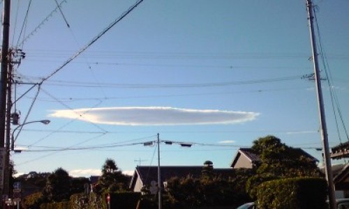 私のショボイ携帯で撮ったので、あまり迫力はありませんが、実際に見た時はギョ!としました。他にはあまり雲が無いのに、ここだけドーンと地面に平行に伸びる雲。何? じ…地震雲? じゃないよね。