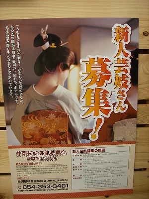 先日、私が働いているフロアーに1枚のポスターが貼り出された。静岡商工会議所の求人だ。それが・・・・うなじもまぶしい芸妓さんの募集だったので、フロアーの住人は騒然となった!「ちょっと~、やる?」「私、飲めるよー!」「え、それ関係ある?」と盛り上がりながら、よく見ればなかなかの好条件(1)新人研修として先輩芸妓が化粧や着付け、踊り、三味線、唄 などの指導を行います。(2)新人への優遇措置として次の各種制度を用意しています。 1.最低保証制度(3年間に限り毎月20万を保証) 2.住宅手当制度(家賃の3分の2を補助) ※ただし上限5万円とし、住居が借家の場合に限ります。 3.その他支度金に関する優遇制度もあります。歌って踊りたいなら、AKBを目指すよりは、堅いな!18歳以上、学歴・資格・経験は問いません。締め切りは3月16日、詳しくは→こちらから