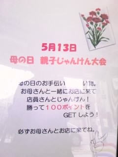 今年はブラウスを値引きとか、ワンピースとか・・値引きセール以外のお楽しみをなにか・・ということで、お母さんと一緒のお客様にお子さんに受け付けのお兄さん(おばさんかもですが)とじゃんけんしてもらって、お子さんが勝ったらお預かりの品物のカードに100ポイント+プレゼントというのをしたいと思います13日、一日限りですが、どうぞ、楽しんでくださいねー。