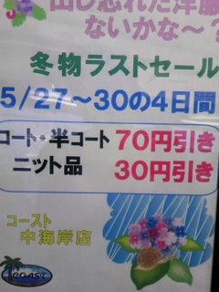 今日は雨がふって、はだざむいくらい。。でももう5月も終盤。。。冬物でまだクリーニングだしてないっ。。というお客様はいらっしゃいませんか?今月27日から30日まで冬物コート。セーターなどの値引きキャンペーンをします。これがラスト、本店ではまだダウンもあつかってまーす。梅雨にはいらない、いまのうちに。次に着る時「あ、カビが・・(;_;)」なんてなりませんように。
