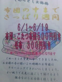 けっこう5月後半、暑いくらいの日々が続いています。6月になって梅雨時はどうなんでしょう??そこで、早めに6月の1日から布団、こたつ布団、毛布をクリーニングサービス料金でさせていただきます。一度に出す量が多くて運べないお客様・・お電話を。夜間ですが、集配にまいります。さて・・御近所さんのきれいなバラのお庭拝見したのでなごんでくださいねー