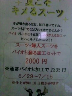 夏といえば、汗・・いつもバイオクリーニングのおすすめをするのですが、今年はさらにうえをいく・・バイオすると水洗いもするのでなんかちょっとくたっ・・とするスーツ感に。そこで、よみがえる加工も。ぷらすすると、しゃきっ・・ぱり・・っとしたはりが出るんです。明日29日から7月15日まで。太陽がでてきましたー。夏の汗にもまけるな、っおまけの写真・・