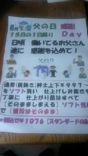 父の日・・・一日限りですが、15日やはりお父さんにもいい気持ち、すっきりした服を・・ということで、スタンダードのお値段でソフトクリーニングをしあがには一週間弱なので翌週になるかと思いますが、ぜひ、お試しください。あと来週まで、毛布クリーニングやっていますー。