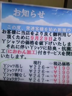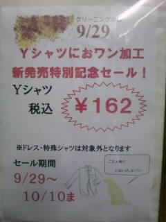 明日、29日から10月10日まで、セール決定しましたー。Yシャツが防臭加工付きで162円ですなを業者さんが限られておりまして、茅ヶ崎のクリーニング店ならどこでも出来るというしろものではありません。ぜひ試しにだしてみてくださいねー。