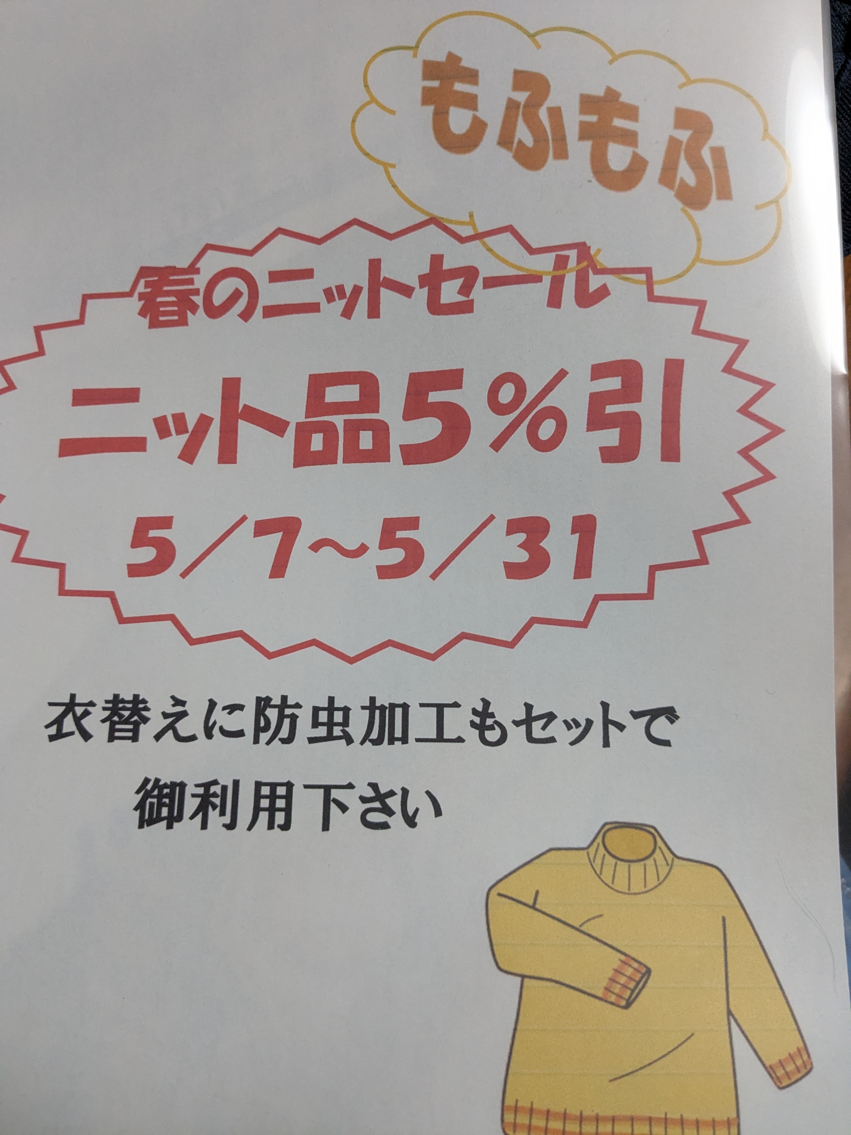 いよいよあったかく・・いや、暑いくらいの湘南地域。セーターなどのニット類をだしてみませんか?これから割引セールです。カシミヤやアンゴラなど、虫にくわれやすいニット系、コートなど、防虫加工ができますので、あわせて受付にてご相談を。ご来店をおまちしていますm(_ _)m