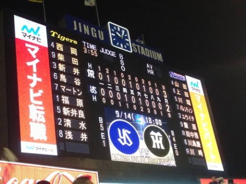 1ヶ月以上前の日記です。最近は、知り合いの社長に頼まれて、土曜日はFXのシステム開発、日曜日はFXの講習で、一杯いっぱいですわ。今日は久々のオフだったので、日本シリーズ見てました。マー君が土曜日第6戦160球を投げて、7戦は登板無いやろと思ったら9回ピシャリで胴上げ投手に。楽天が日本一おめでとう。 うちは交流戦で1つも勝てなかったね。責任を取って、負広は辞めてくれ。和田もドラフトの抽選2回も外しよってからに。 【9/13(金)】13日の金曜日。ジェイソンことスタンリッジが先発。バレンティンを低めで打ち取ってうまく試合を作ってくれました。マートンの一発も効果的でした。真弓監督時代から続く神宮での観戦連敗を4でストップ ナイスピッチング。神宮名物 ウインナー盛り¥500 バレンティンのお面。センターバックスクリーン入場口なら貰えました。 耳に穴開けて輪ゴムをくっつければ、仮装で使えたりするか!? 【9/14(土)】この日は、kokkunnさん、りんさん、親方さんが上京されました。銀座線の外苑前駅近くのスタバで待ち合わせ球場到着が17時くらい。座席はポール際でした。 試合前にマートンと浅井がノック受けていました。(浅井は解雇になったからこれが見納めでしたわ・・・マートンも分からんぞ)マートンはゴーグル?手袋?か何かをファンにプレゼントしていましたね。フェンスのところに置いて、「勝手に取ってくれ」というジェスチャーでしたね。 先発はルーキーの藤波晋太郎。彼は神宮で勝ててないです。ハマスタ、甲子園、東京ドーム、ナゴヤドームと見てきた彼の勝利ですが、神宮だけが未だ見れず。。途中、マートンが本塁突入のプレーで相川と接触して、両軍入り乱れての乱闘がありましたね。まぁ、普通のプレーでしょう。その後、突っかかるのが良くない。当然両者退場でしたわ。 映像を見ると西岡と池山コーチがラブラブモード??でしたねぇ。藤浪が左上のほうで次イニングに備えてキャッチボール開始? 引退する宮本にも大歓声でした。1球目をヒット。これも最後の勇姿やったな。 試合は僅差負け。藤浪の神宮初勝利は来季までお預けですわ。試合後は、りんさんが待ち焦がれていた??無敵家に。虎格好でどういう店員がどういう反応か楽しみでしたが、普通でした。 注文したのはねぎ麺。九条ねぎをふんだんに使っています。HP参照りんさん、kokkunnさん、親方さんも満足されたようで良かったです。 あ、お土産ありがとうございました。ちょっと、長くなったので、ここまで。(引っ張りすぎ?)次回は今季観戦最終戦。バレンティン56号57号連発をお送りします。【競艇】久々の予想です。鈴木詔子選手がレース前の練習中にコンクリート製の壁に衝突死。。。ご冥福をお祈りします。ホンマ、危険ですね。。で、優勝戦ですわ。下関12R 優勝戦1. 寺田 千恵(岡山)2. 高橋 淳美(大阪)3. 海野 ゆかり(広島)4. 倉田 郁美(愛知)5. 岩崎 芳美(徳島)6. 太田 雅美(佐賀)1→23→91→5→23難解ですねー。この舞台で過去に女子王座に輝いたことのある寺田選手が軸で。