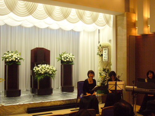 先日、近くで音楽葬ってどういうものかの見学会があり、母とでかけてきました。ご葬儀って、色んな宗派があるけれど、仏教の場合、お坊さんのお経は必須と、なんとなく思っていました。今は、もう葬儀の考え方も多種多様になってきていて、無宗教スタイルで行う方も多いようです。祭壇にしても、今は芸能人の方々は花祭壇にされる方が多いのでお花、しかも様々な色とりどりのお花の祭壇が多くなってきてるそうです。で、音楽葬、というのは、実際に演奏者の方々が、式の流れにふさわしい音楽を生で演奏してくださるものです。ご本人やご家族の希望で、その方がお好きだった曲を、葬儀にふさわしいアレンジで演奏してくださるのです。実際に何曲も演奏してくださいました。バイオリン、フルート、電子ピアノ、の三重奏です。たとえば、G線上のアリア千の風になって川の流れのように星に願いを別れの曲涙そうそうふるさとイエスタディ などなど美空ひばりさんやビートルズが人気があるそうです。もちろん、無宗教の場合は式の間ずっと、献花や、弔電、挨拶、などに合った演奏がされますが、読経などが入る時は、最初と、最後のお見送りの時のみ生演奏が流れる、というケースもあるようです。最後のお別れに、上を向いて歩こうとか、星に願いを、とか流れたら、会葬してくださった方も、悲しい気持ちを何とか立て直して、気持ちをシャンとしてくださるかも、なんて事を感じました。お花の祭壇も、すっきりとしていて私だったらこうしたいな〜、なんてね。いつかは必ずやってくる日のために、色んな選択肢を知っておくのはいいことだと思います。それは、数ヶ月後か、数年後か、数十年後かわかりませんが、知っておいて、準備しておこうと思います。
