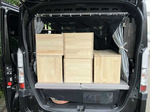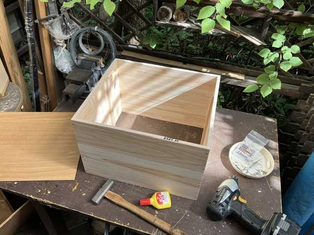 ★朝空大きい方の箱を 作ります昨日のガイドで ネジ穴4つ 一気に開け ネジ頭 凹まし 掘りネジ 4 × 4 = 16ボンド ちょっと51mm のネジで 固定した、 ( 四隅は38mmで仮固定し 中央2ネジを51mm固定した後 38を抜いて51mmにしてます いきなり長いネジを使うと板がズレることがあるし、隅は板が割れる場合があるからです ) カンナで面取りして内側の縁は 紙やすりし 今回は 特別に丁寧に仕上げてます( 内径は30.5cm A4 が入る 背板は用意してません )完了あと 3箱★