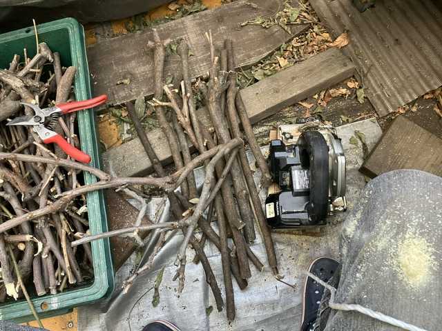 ★先日 深切りした藤の枝を電動ノコの空中切りで 細断し長めの枝は 別にし貯まった枝を含めてナタで杭を作った小筑山の片側に杭を打ち 枯れ葉や小枝を入れ高くしたいのです土穴が埋まらないのよワイルドなこと やってます〜ーーあさ晴れましたね★