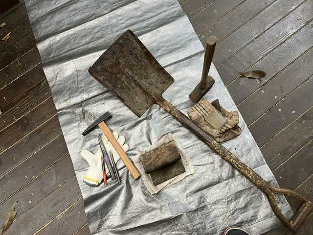 ★ グズつく天気の中 コンクリ用?のシャベル( 地方のICを降りるカーブに かつて このスコップが落ちていたのです 危ないと思い ハザードで 左に止めて 走ってもどり 拾うわ 乗って進みました コンクリだらけで 一度 コンクリを雑に 落としたが ) をへばりつくコンクリが気になり はがそうと 金床 タガネを用意して荒砥石も使いゾリゾリ ガリガリ トンドン濡らして砥石で油をぬると 付着のコンクリが浮き出るタガネで叩き割り剥がしたあまりきれいにはならなかった が 中締め〜油ぬって それなりになると 使いたくなりますね〜★