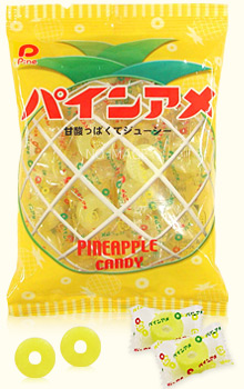 昔からよくスーパーで見かける飴ですが、これまで食べた事がありませんでした。今日初めて買ってみたんですが、とっても美味しい!甘酸っぱいです。本物のパイナップルの輪切りみたいに真ん中に穴が開いていて可愛らしい。最近ハッカ飴に少し飽きてきてたので、新しいお気に入りを見つけられて嬉しいですー。