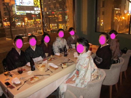 以前 日本和装の プラチナコースで ご一緒だった方々とヴィアブレラで 夕方5時から 新年会でした ViaBRERA ヴィアブレラ札幌市中央区南3条西2丁目6番地KT3条ビル1FTEL.011-887-7381 FAX.011-887-7382OPEN 18:00 ~ CLOSE 24:00(L.O. 23:00)ランチ OPEN 11:30 ~ CLOSE 15:00(L.O.14:00)日曜定休 その名も 札幌シロガネーゼ ^^T先生も ご出席頂き 久しぶりに お会いすることが 出来ました札幌シロガネーゼは 全部で8名なのですが 残念ながら今回は ご都合で Kさんが欠席です 私を除いた 7名の方は プレミアムコースに進まれきもの道を 更に 極めていらっしゃいます 先日1月20日に 行われた ブリリアンツ札幌大会では我が札幌シロガネーゼより なんと おふたりの方が 選ばれ夏の東京全国大会へ 行かれるそうです w((´ω`))wワオッ!! ゆっくり 時間をかけて 頂いた イタリアン 私は 皆さんと 3ヶ月ぶりに お会いしたのですがやっぱり レベルアップを 感じました~そして 私のイタリア旅行の話から どんどん話は 膨らんで来年を目標に 着物での 『 札幌シロガネーゼ パリへ行く! 』計画が .+:。(ノ・ω・)ノ゙10名程の お着物チームで ルーブル美術館に行きましょうと 盛り上がる 盛り上がる~ぅ 新年会なんだからと 気張って お召し(笑半襟は ビーズの白 そんな風に 思い込んでいたのは 私だけのようで他の方々は 洒落ものの紬が多かったです ^^; カトレアの花の 九寸名古屋帯 私のみ 銀糸のピカピカした お召しで アンティークっぽかったのでちょっと 浮いたいた感もありますが娘は 「 その着物 いいね 凄くスキ 」って 言ってくれたので「 高校の卒業式に これと袴にしたら? 」と 提案した私なのでした