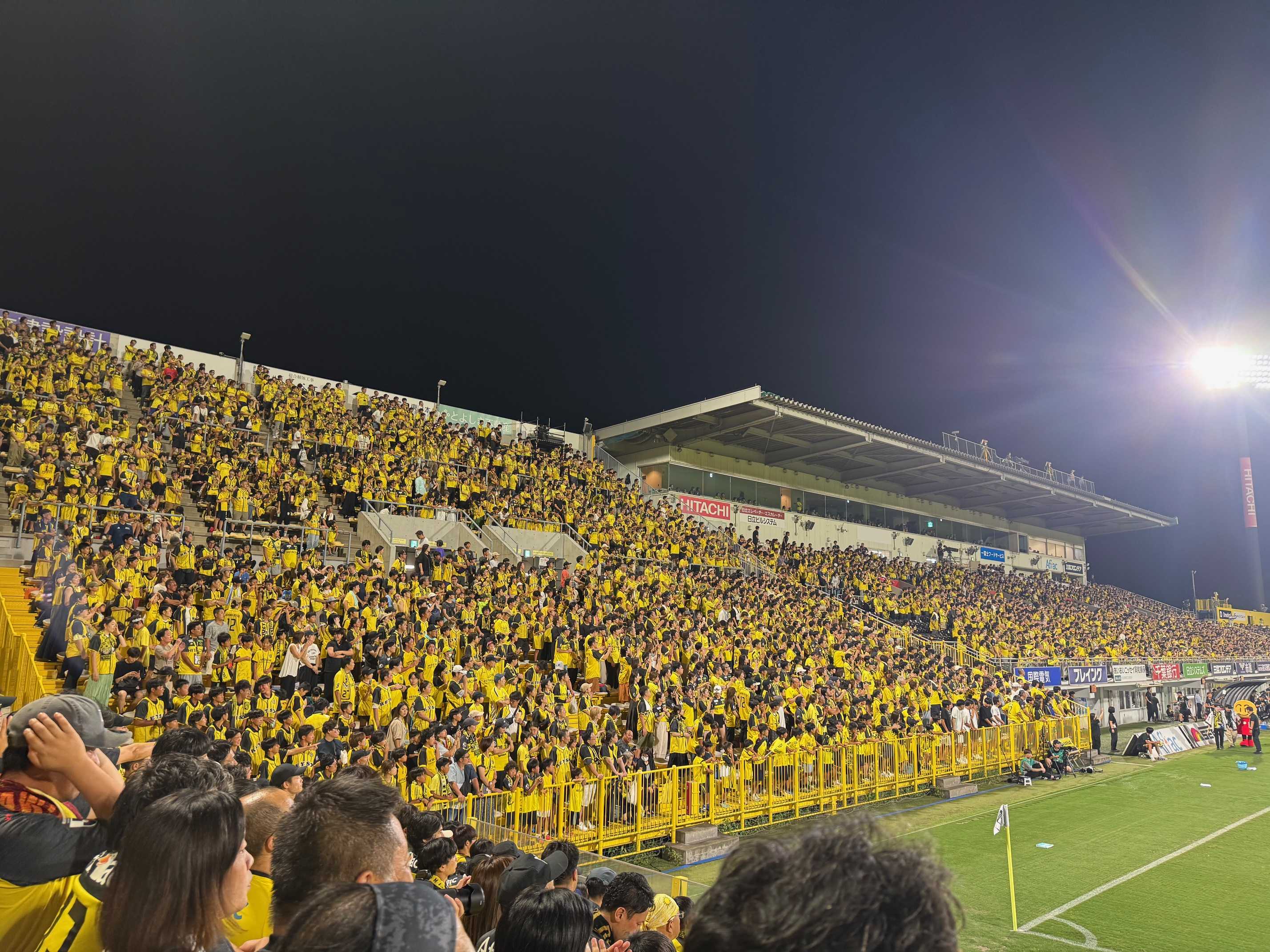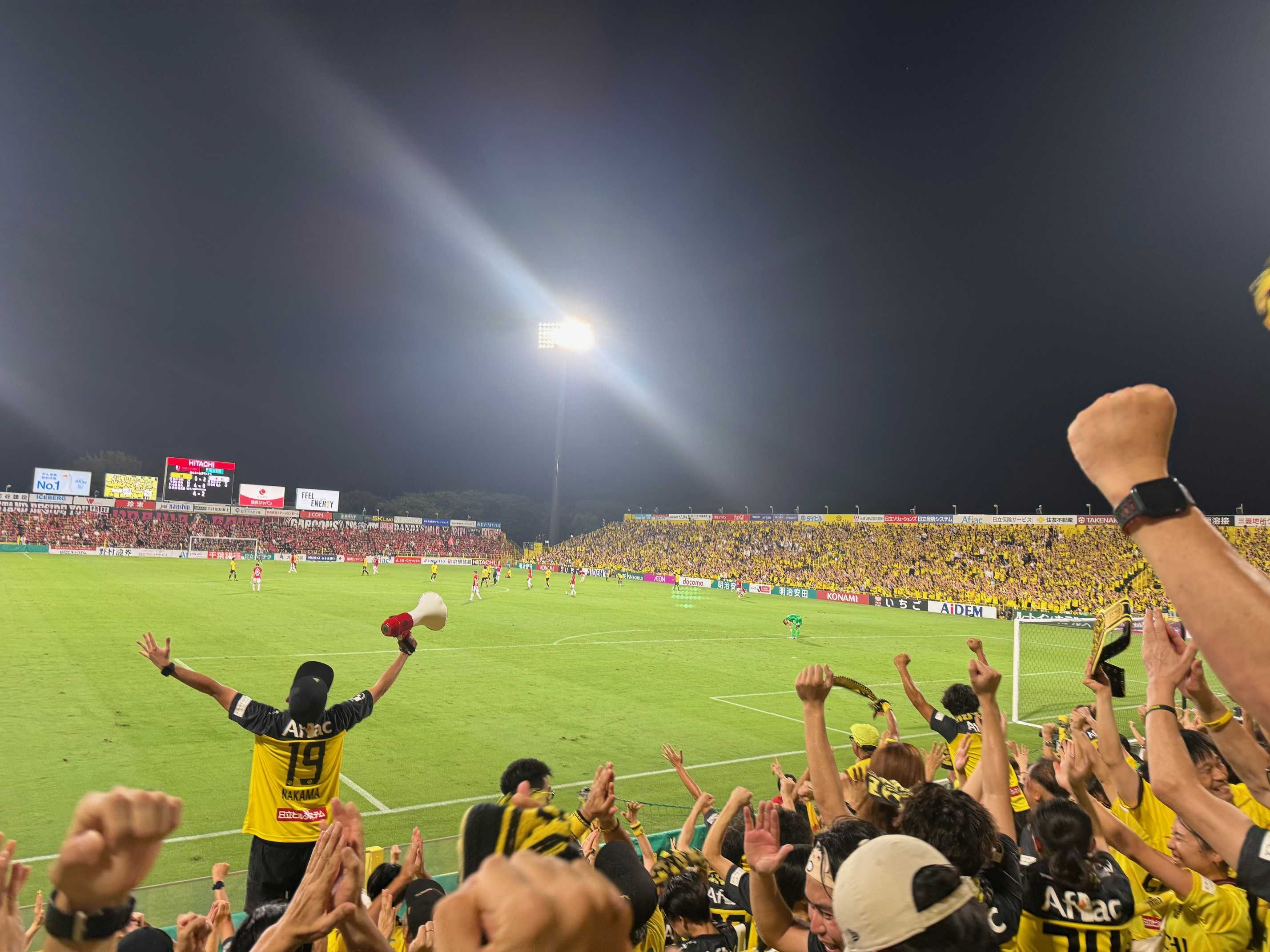 今節唯一のフライデーゲーム。レイソルサポーターにとっては熱狂の渦となる素晴らしい試合だった。平日の試合でありながら相手がレッズ、しかも上位対決ということでチケットは完売。試合開始の7時にはほぼ座席が埋まっていた。この試合は本当に大事。負ければ優勝は厳しくなるし勝てば優勝戦線に残って争いを続けられる。Jリーグの応援といえばレッズとイメージする人も多いと思うがコールリーダーもかなり気合が入っており「二階席の皆さんも今日は声を出しましょう」と鼓舞。試合前からボルテージは上がっている。にも拘わらず前半のうちに二失点で0対2。重苦しい雰囲気がただよう。コールリーダーは「まだ諦めてないよね!?」と声のボリュームを上げるが正直「これはかなり厳しい」と思わざるを得なかった。それでも応援するしかないので声をからして選手を鼓舞する。後半一発目のチャントが「突き進め柏」正直このチャントの時に点が入った記憶が無い。それにこのチャントは押せ押せな展開になった時に一気呵成に攻め立てるためのもので何もないところから希望的観測で歌うものではない。案の定すぐ終了。ただここから快進撃が始まる。まず後半頭から投入された瀬川が密集の中見事なボールコントロールからの得点で1対2。更に直後投入された真大が残り少ない時間で同点ゴール。やはり真大がゴールを決めると俄然盛り上がる。そしてロスタイム。こちらも途中交代の小西が放ったシュート?クロス?というキックがゴールに吸い込まれてついに逆転!それでもレイソルは攻撃の手を休めずとどめのゴール。そしてタイムアップ。前半0対2から怒涛の攻めで後半だけで4得点して逆転。正直こんな試合は記憶にない。得点の度に周りの皆さんと揉みくちゃに。実に痛快な試合だった。優勝する時ってこんな劇的な勝利をした時と思う。優勝するような予感がする。とりあえず最終戦の一試合前の新潟戦のアウェイ用のホテルを予約しようかと思ったが十分日帰りができる試合開始時間だった。岡山の時みたいに雷雨で試合開始時間が変わります、てなことが無ければ。残り11試合。全てが決勝戦だ。来週の福岡戦も日立台でできる。大きな山である10月の相手は強敵ぞろい。これを乗り越えられば夢の旅路がまだ続けられる。でも大きな成功を手に入れるようにみんな一丸で頑張ろう